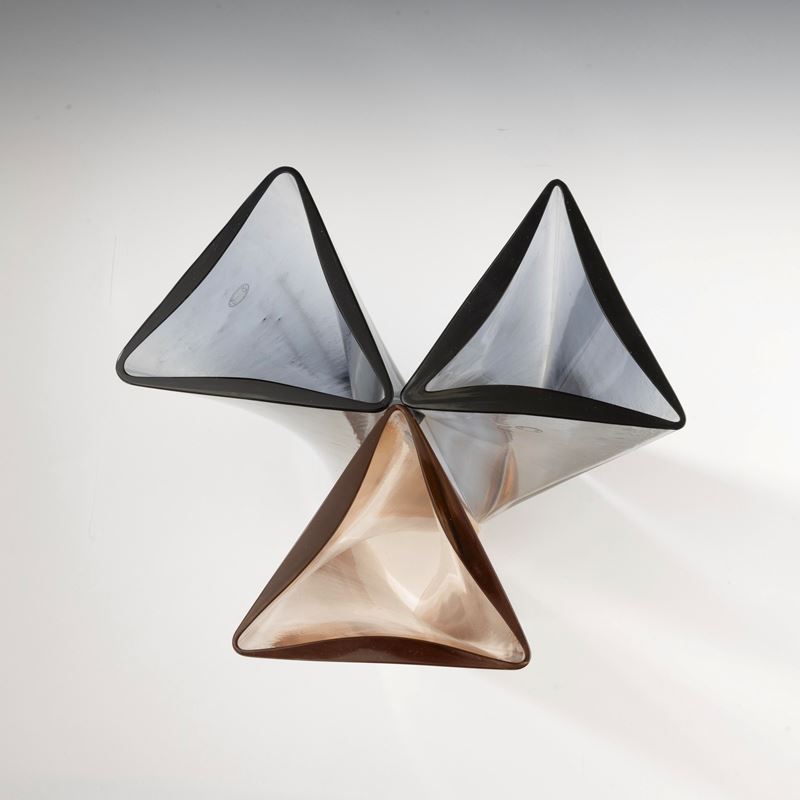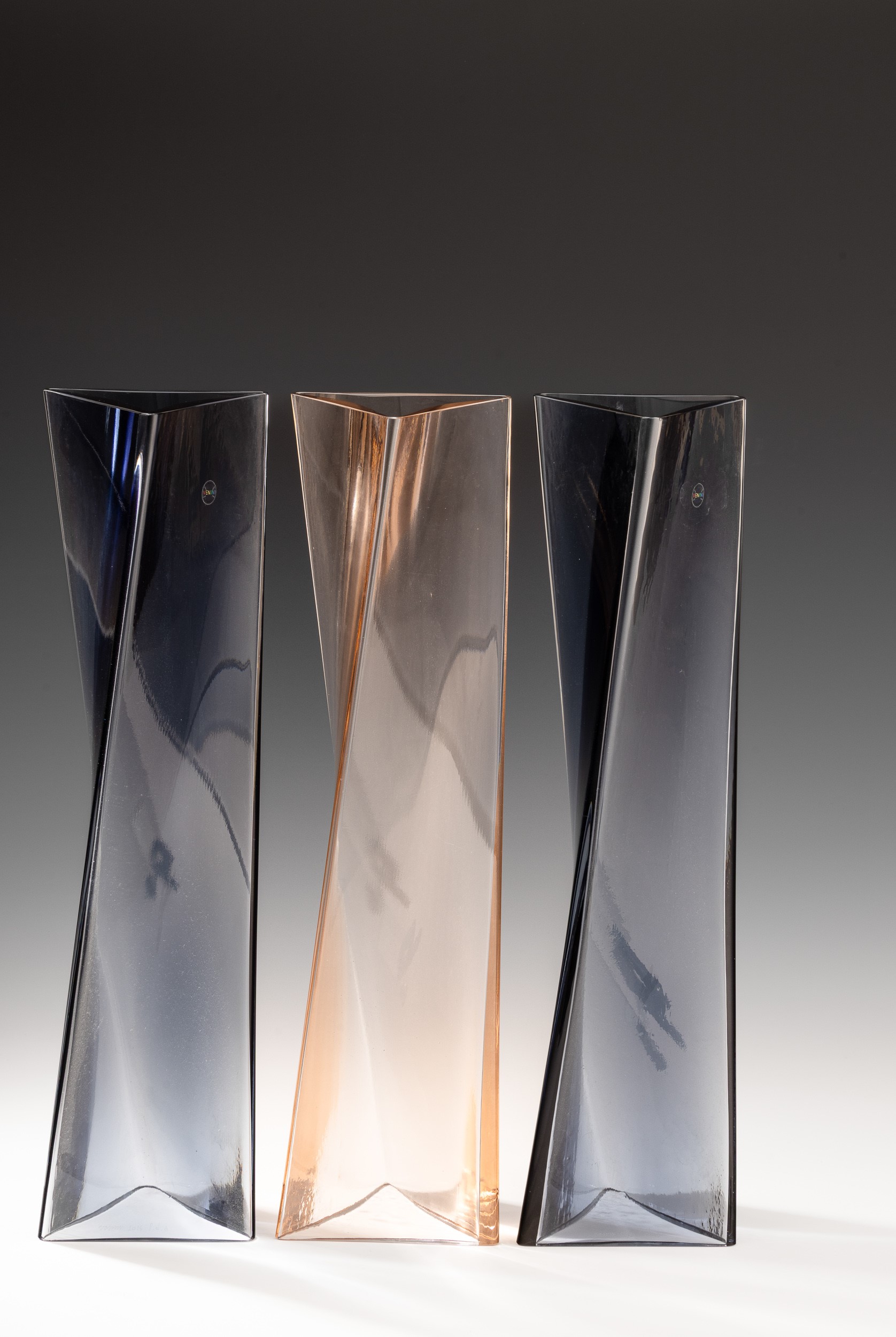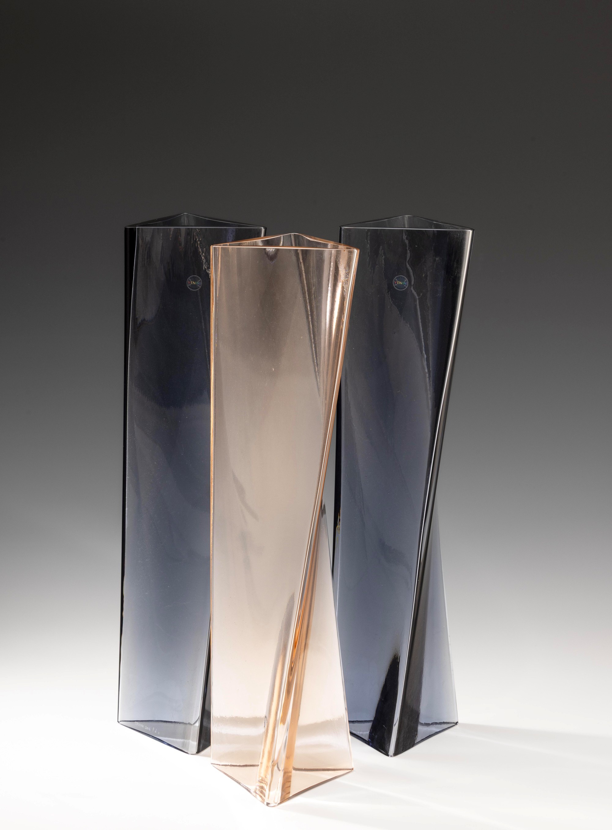 Tre prove d'artista per la serie Ando in vetro soffiato a sezione triangolare senza fondo nei colori fumè e rosato.