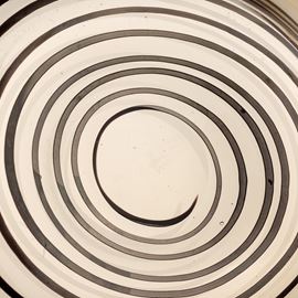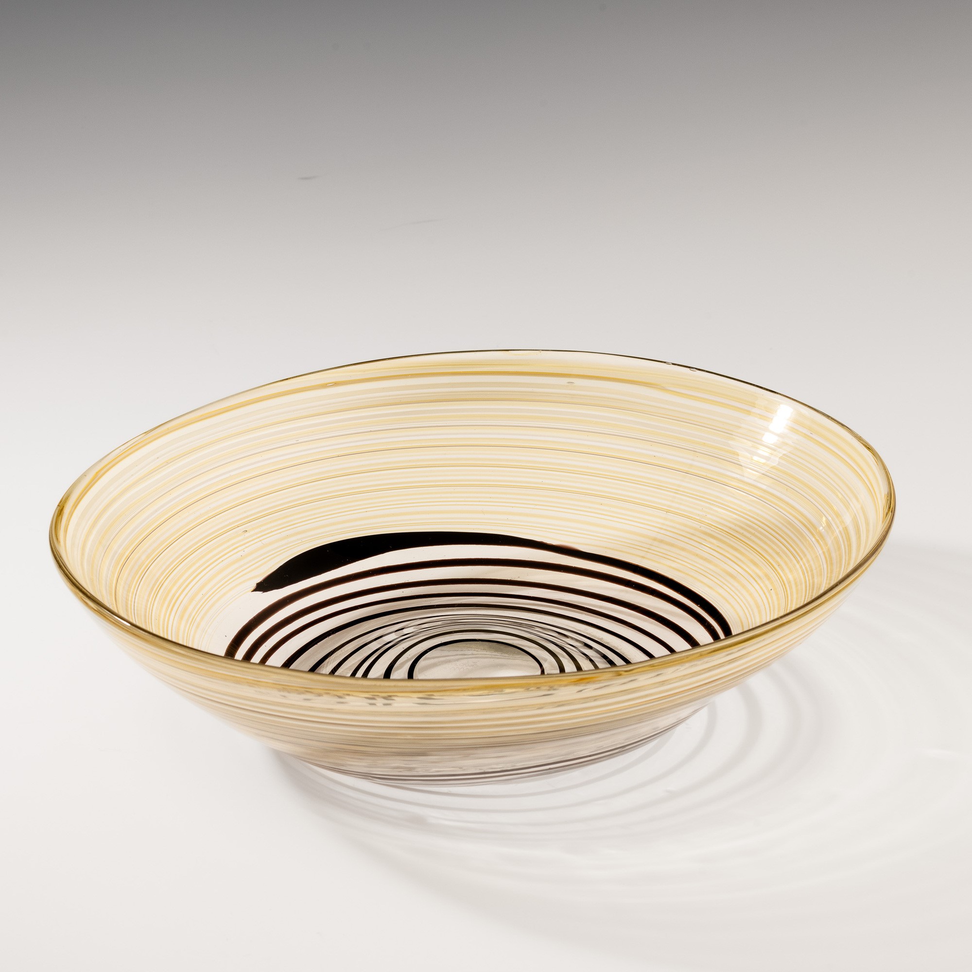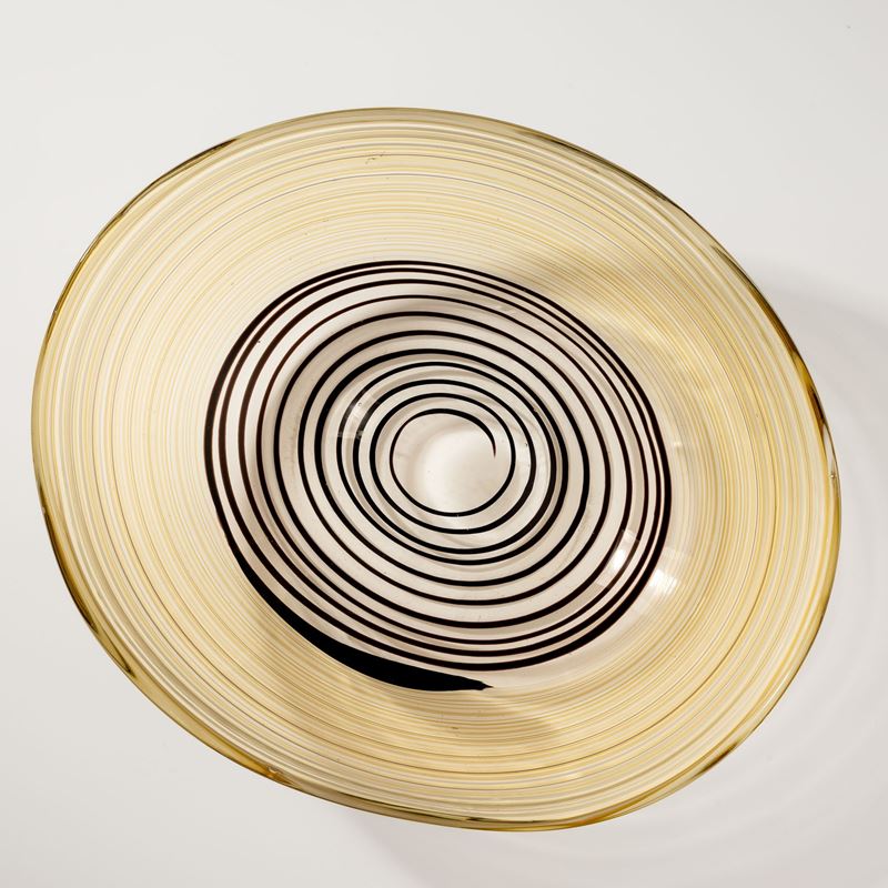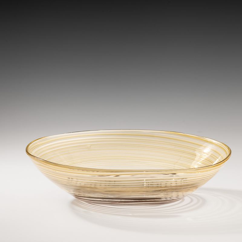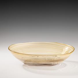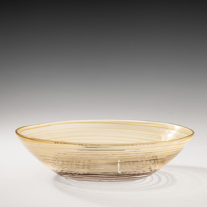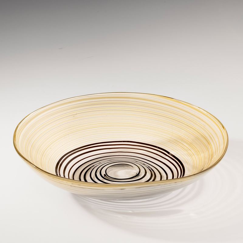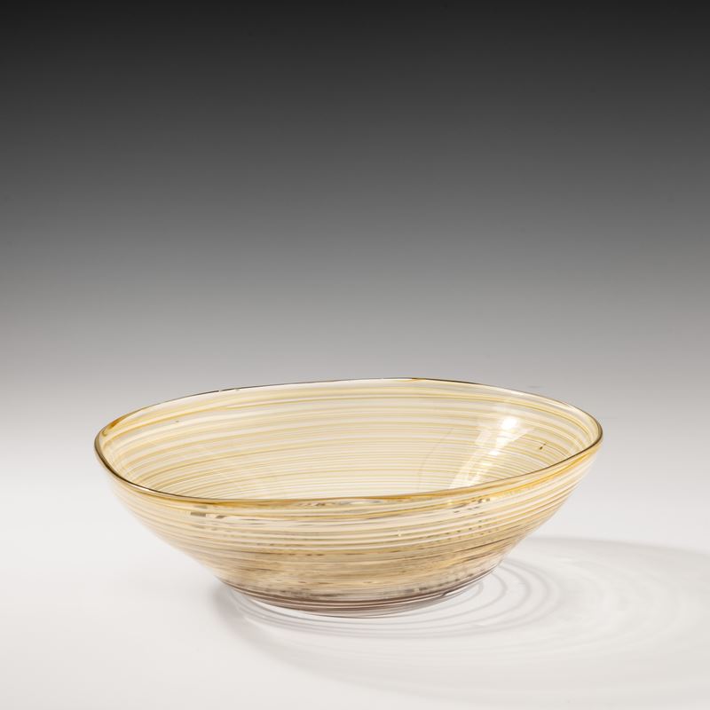 Grande coppa ovale serie A Fili in vetro soffiato pagliesco con decoro di fili ametista scuro, giallo e lattimo.