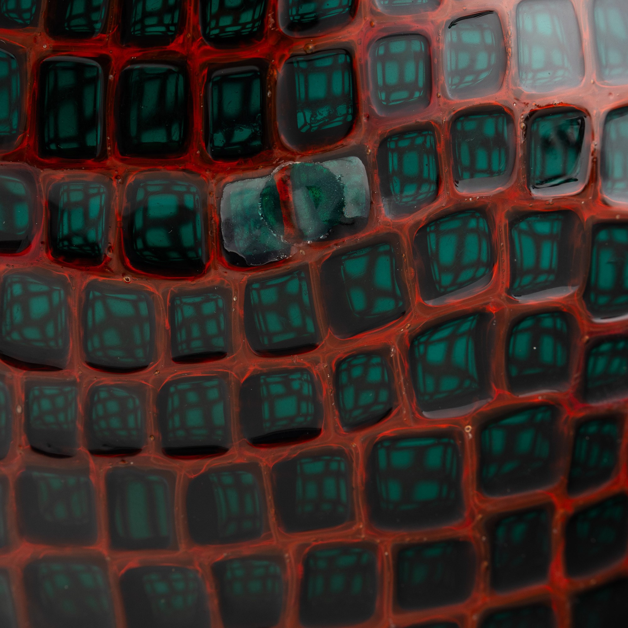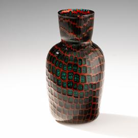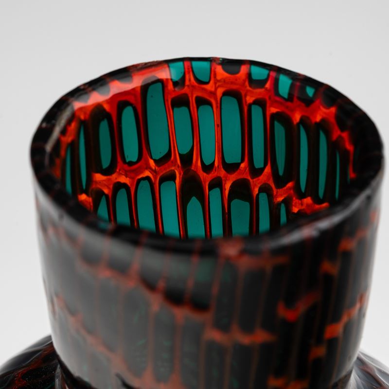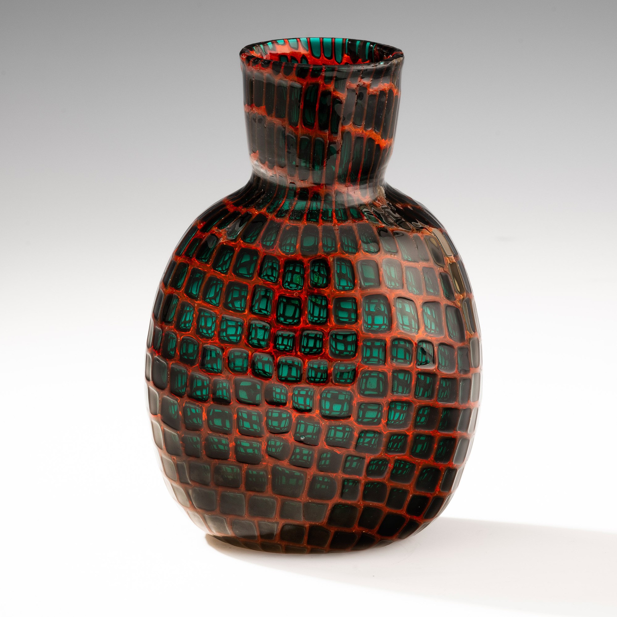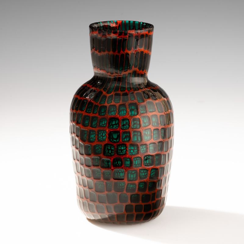 Vaso prototipo serie Occhi in vetro soffiato con decoro di murrine verdi trasparenti entro cornice.