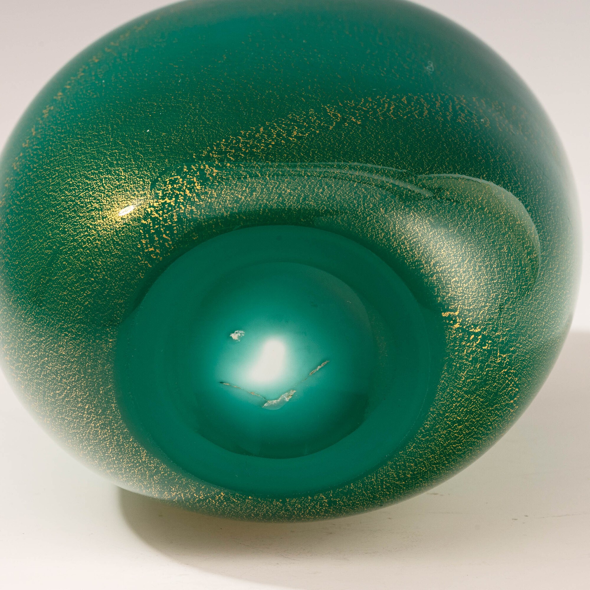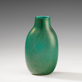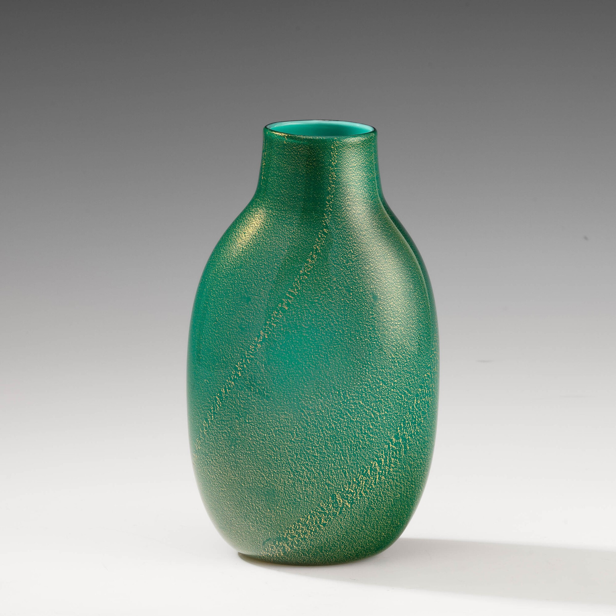 Vaso a sezione ovale in vetro opalino sommerso con decoro di foglia oro.