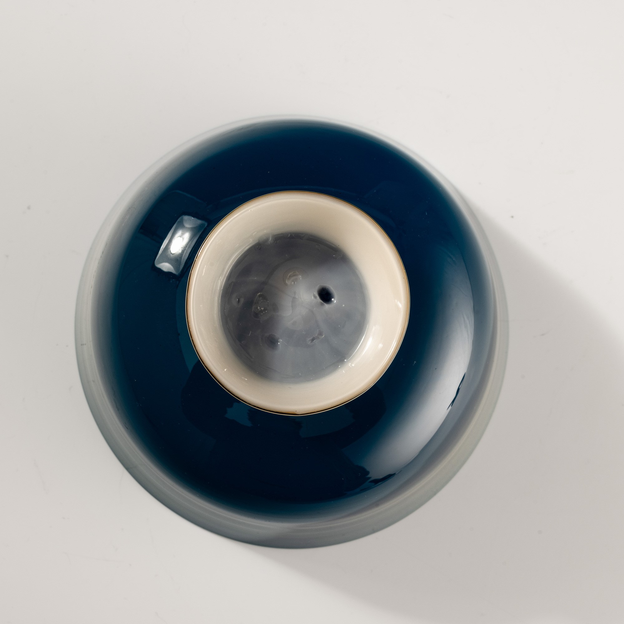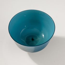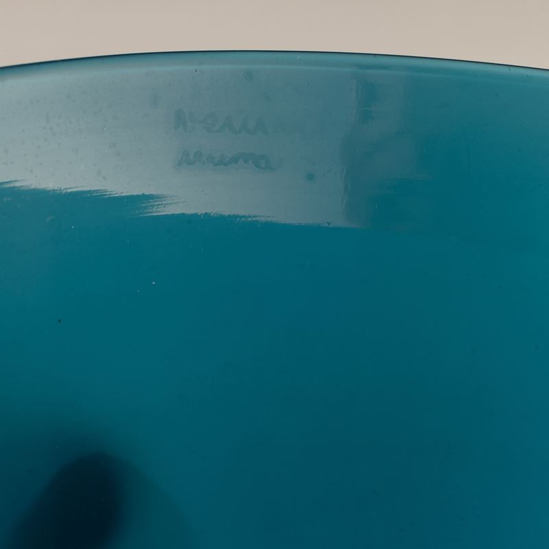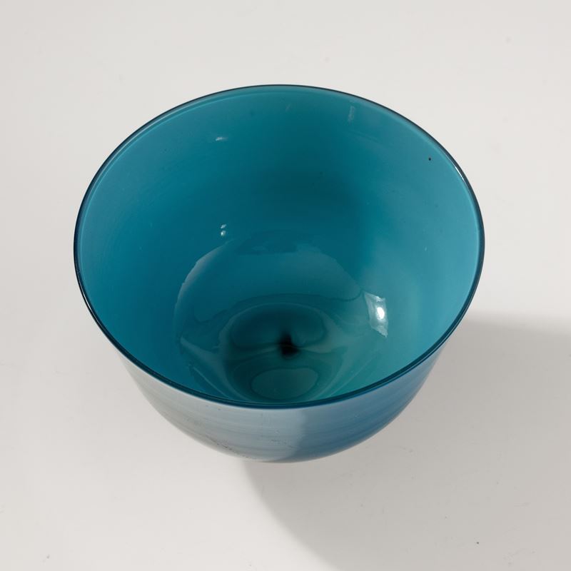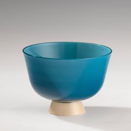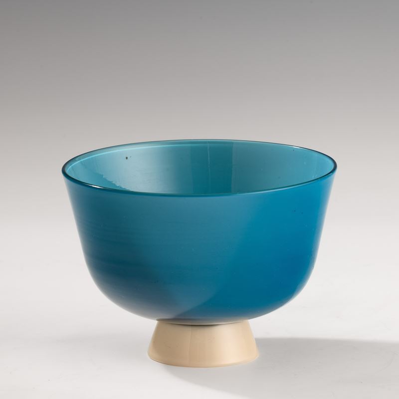 Coppa in vetro soffiato opalino blu su piede troncoconico avorio. Firma all’acido Venini Murano.