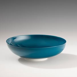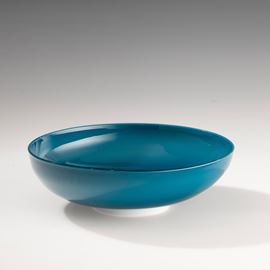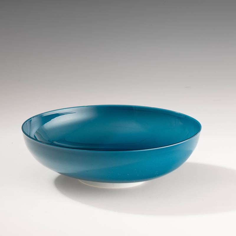 Grande coppa in vetro soffiato opalino blu su piede a disco lattimo.