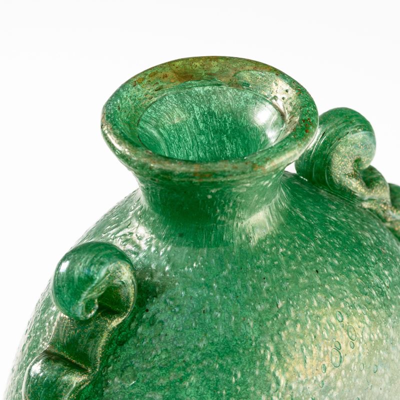 Vaso a fiasca in vetro pulegoso con superficie interamente iridata e decoro in foglia oro.