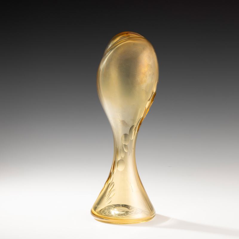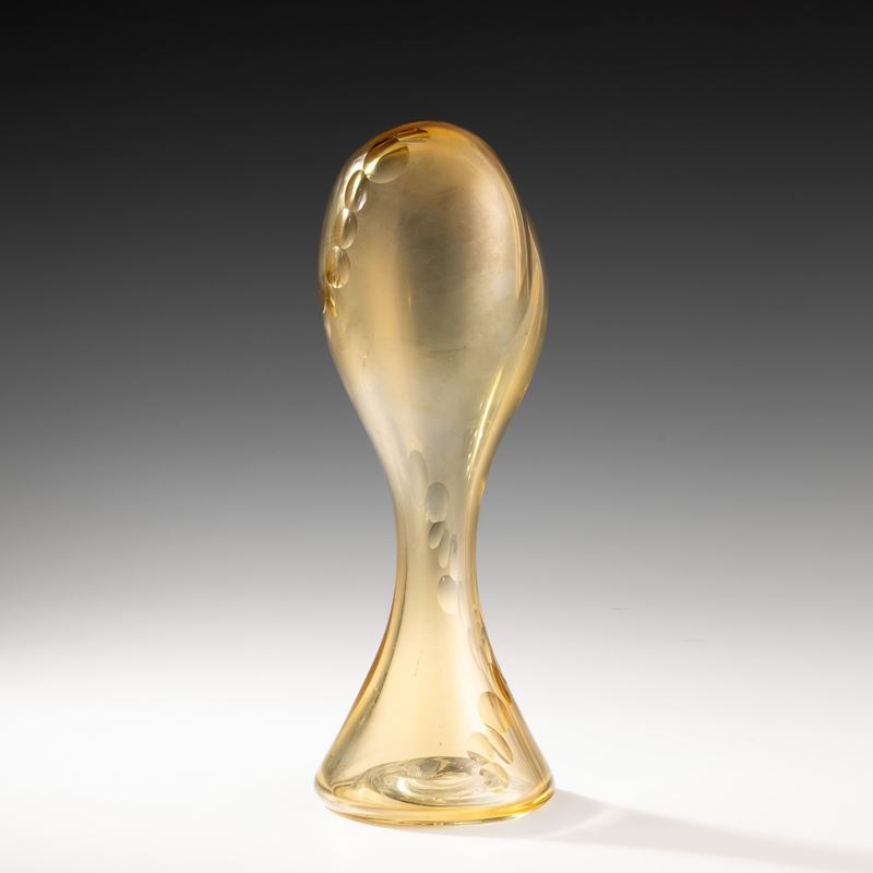 Scultura in vetro soffiato pagliesco con decoro a fasce di molature a lente. Superficie interamente iridata.