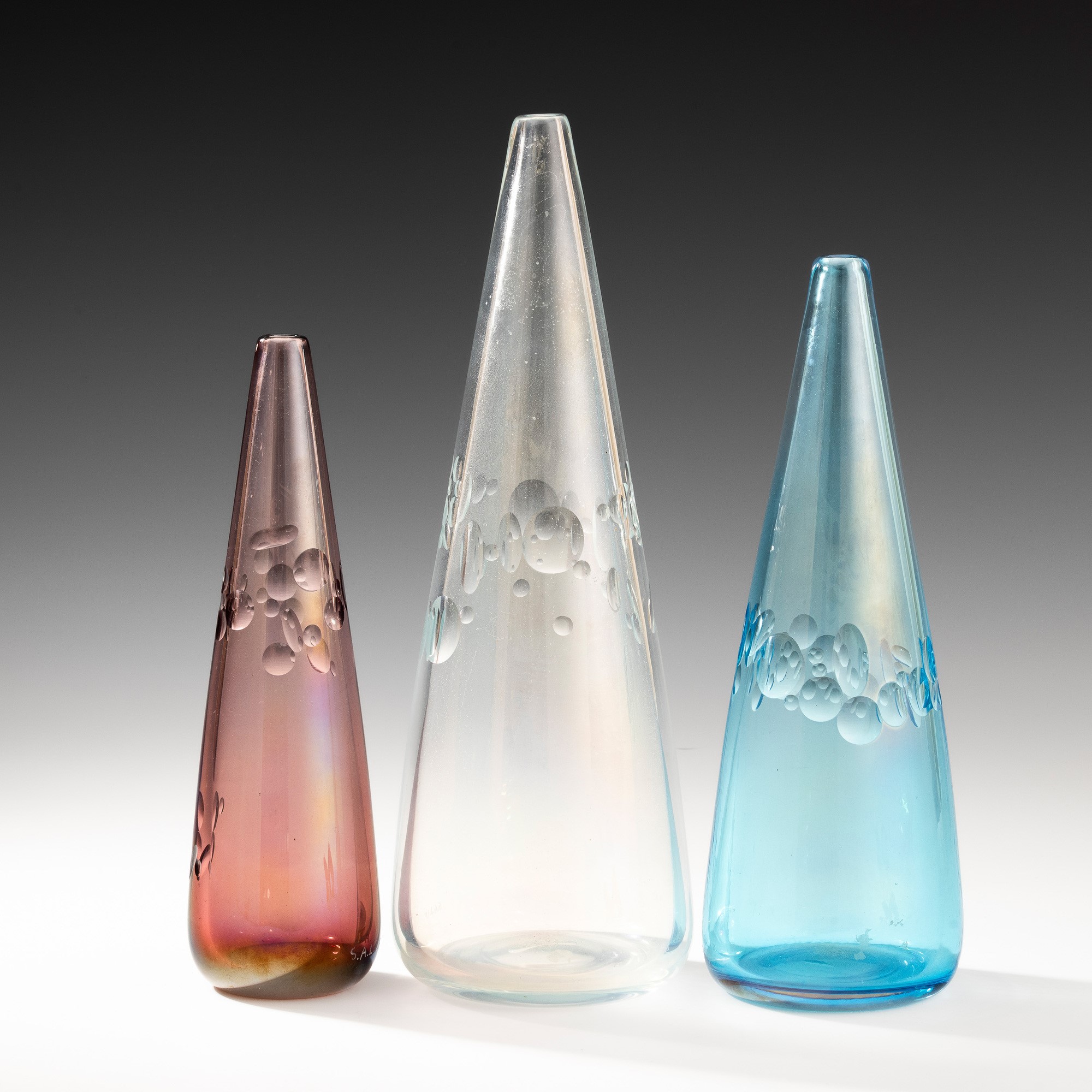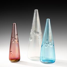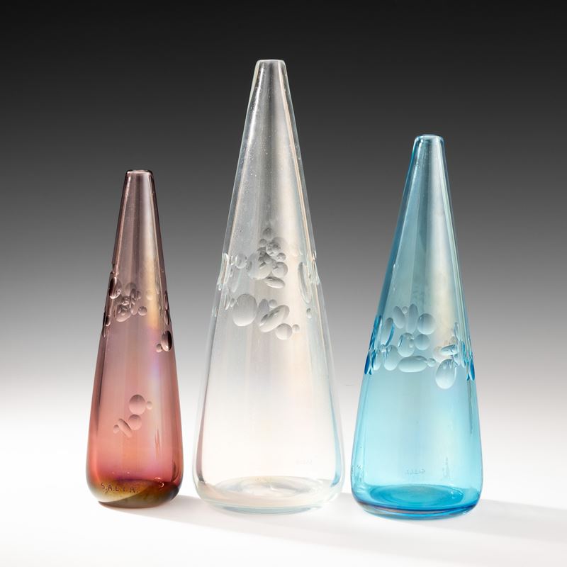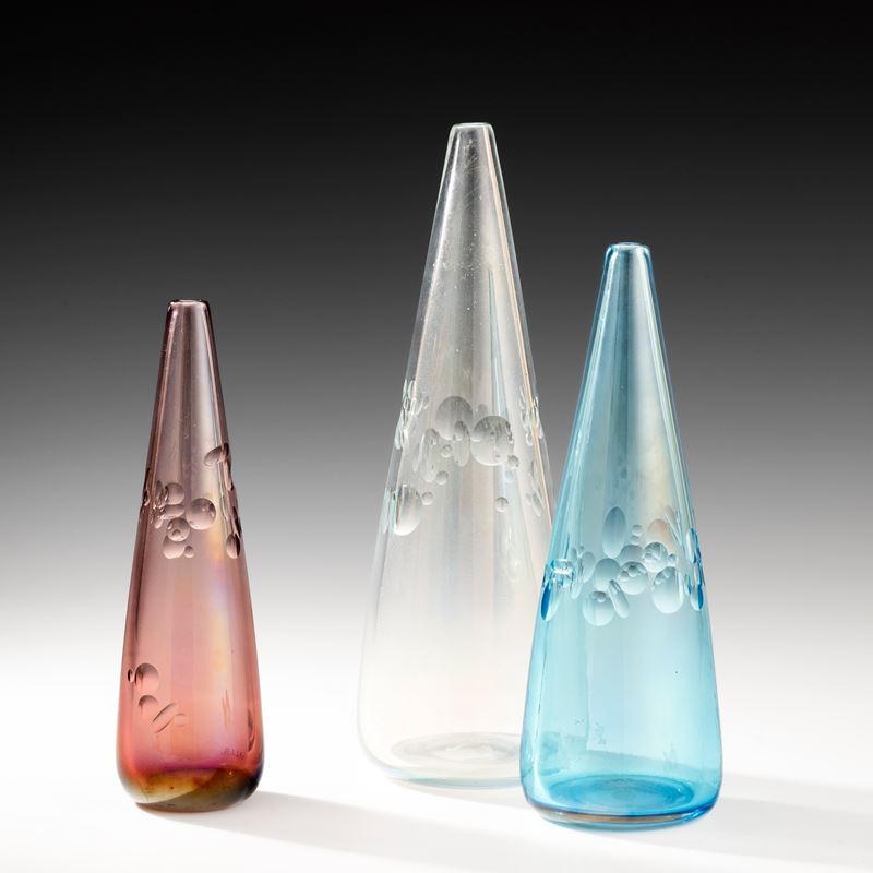 Tre vasi serie Milleocchi di forma conica in vetro soffiato ametista, cristallo e bluino con decoro a fasce di molature a lente. Superficie interamente iridata.