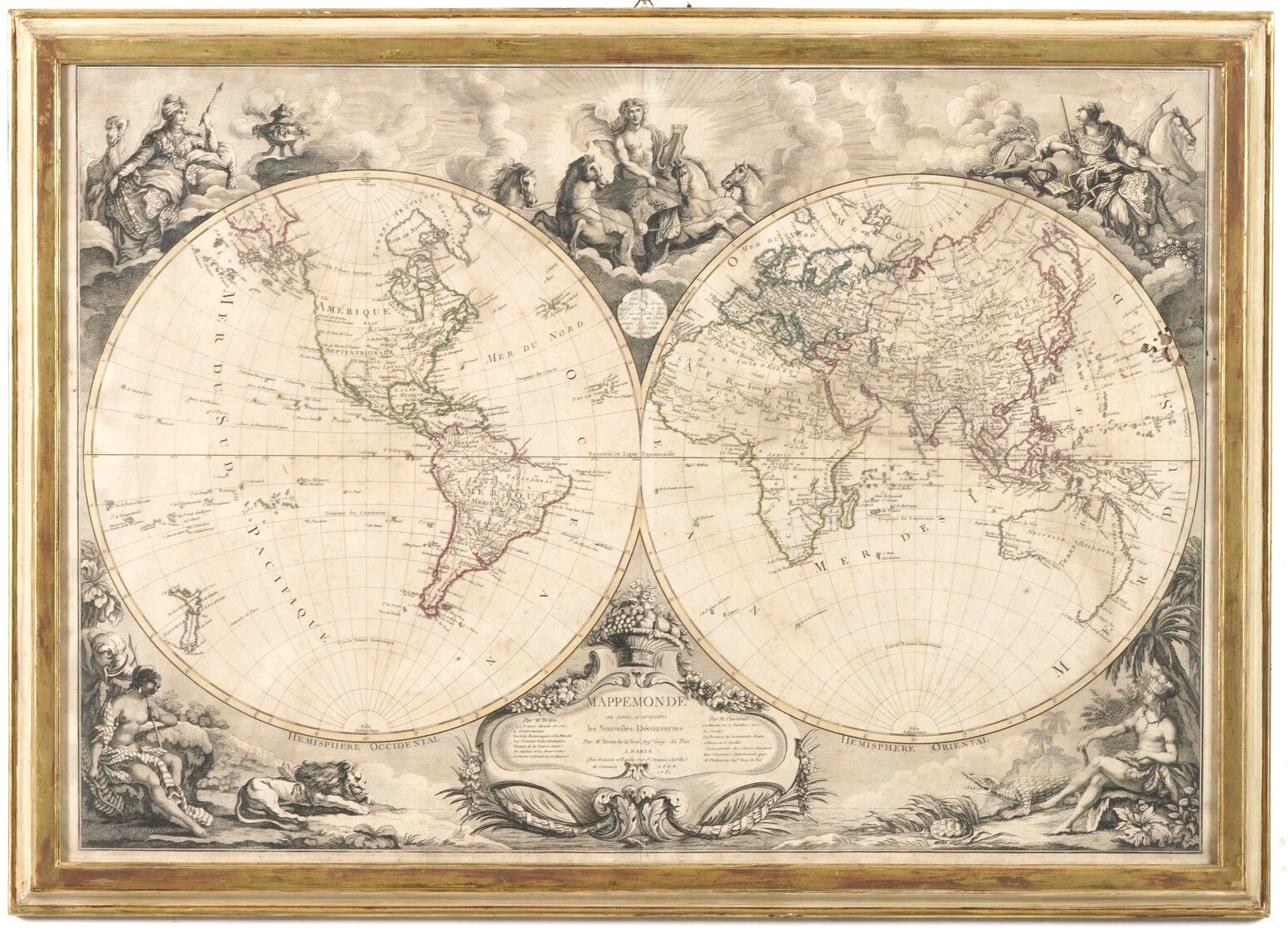 Incisione calografica. Confini dei continenti colorati ad acquarello. Lieve foxing e piccole mancanze. Dimensioni foglio mm 560x798, cornice mm 610x852. Entro cornice