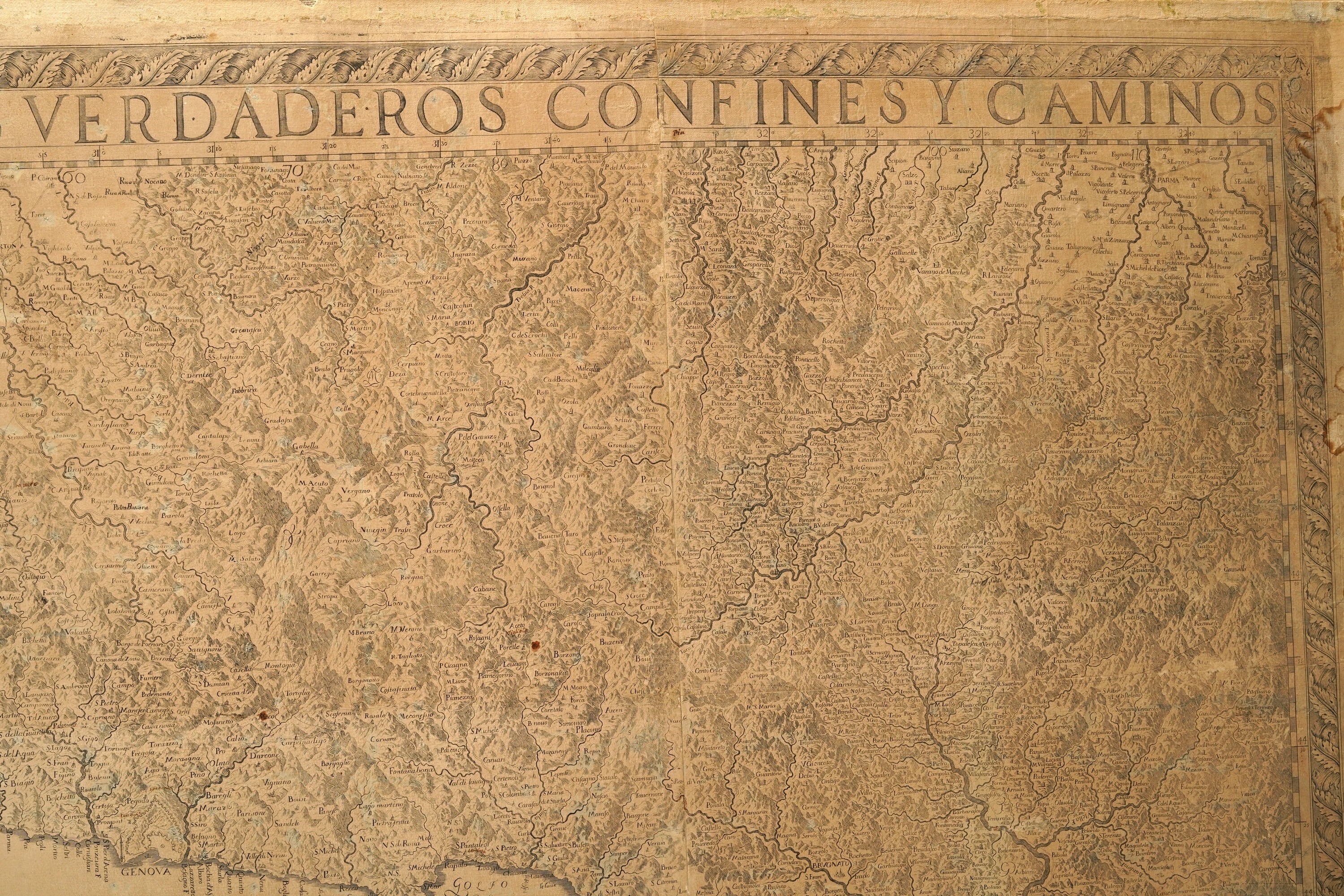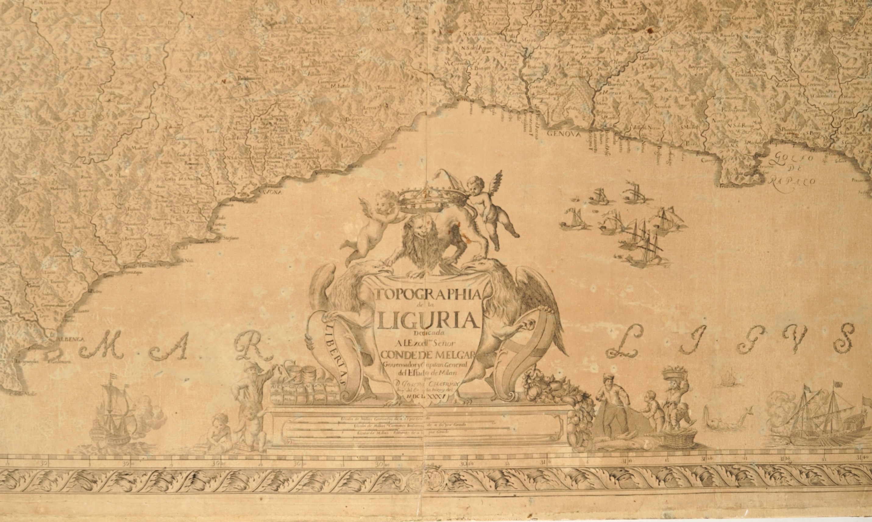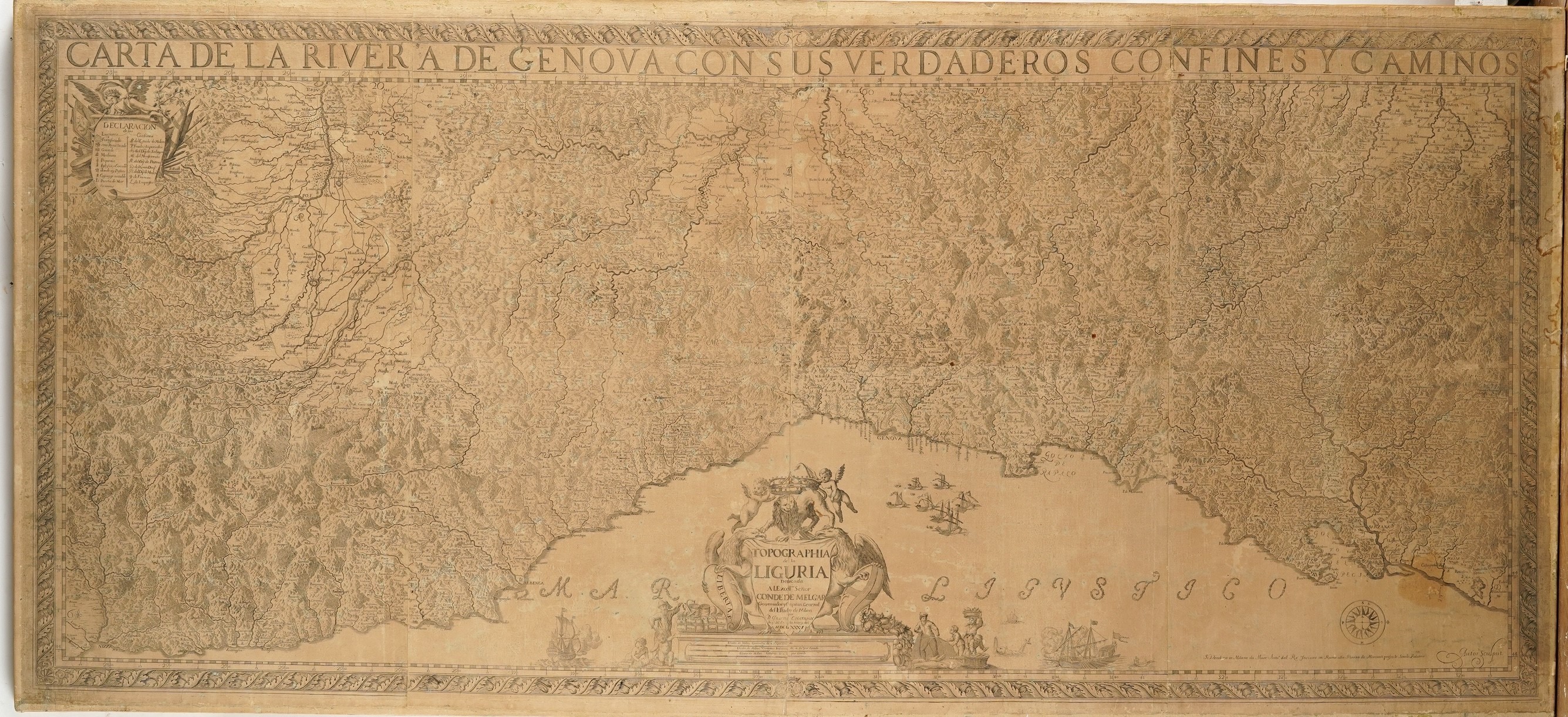 Chafrion, Joseph (1653-1698) Carta del la Riviera de Genova con sus verdaderos confines y caminos. / Topographia de la Liguria. Dedicada A L'Excellmo Senor Conde de Melgar del Estado de Milan por D. Joseph Chafrion...Milano, Marcantonio dal Re, 1685