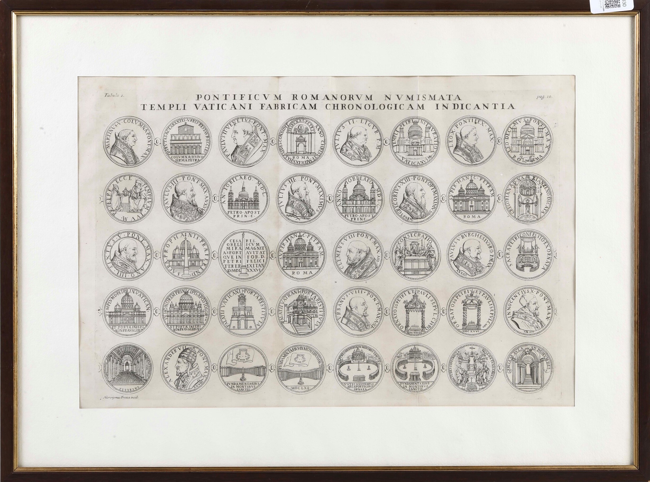 Incisione calcografica presumibilmente tratta da "Numismata summorum pontificum templi Vaticani fabricam indicantia" di Filippo Bonanni (1638-1725). Buona impressione, carta con lievi tracce di pieghe verticali. Dimensioni lastra mm 272x406; cornice mm 425x570