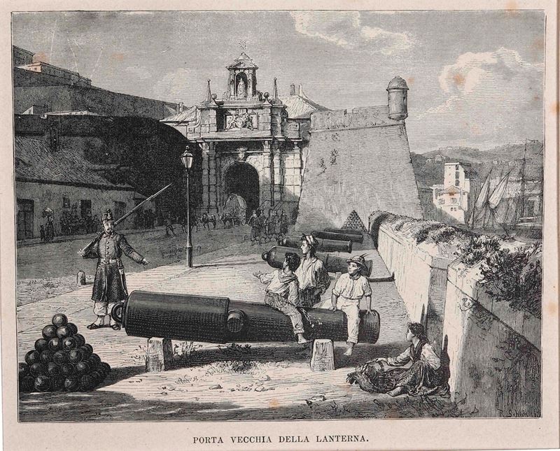 - Porta vecchia della lanterna, illustrazione tratta presumibilmente dal volume "Italia. Viaggio pittoresco dalle Alpi all'Etna", dimensioni ritaglio cm 34,5x27,5