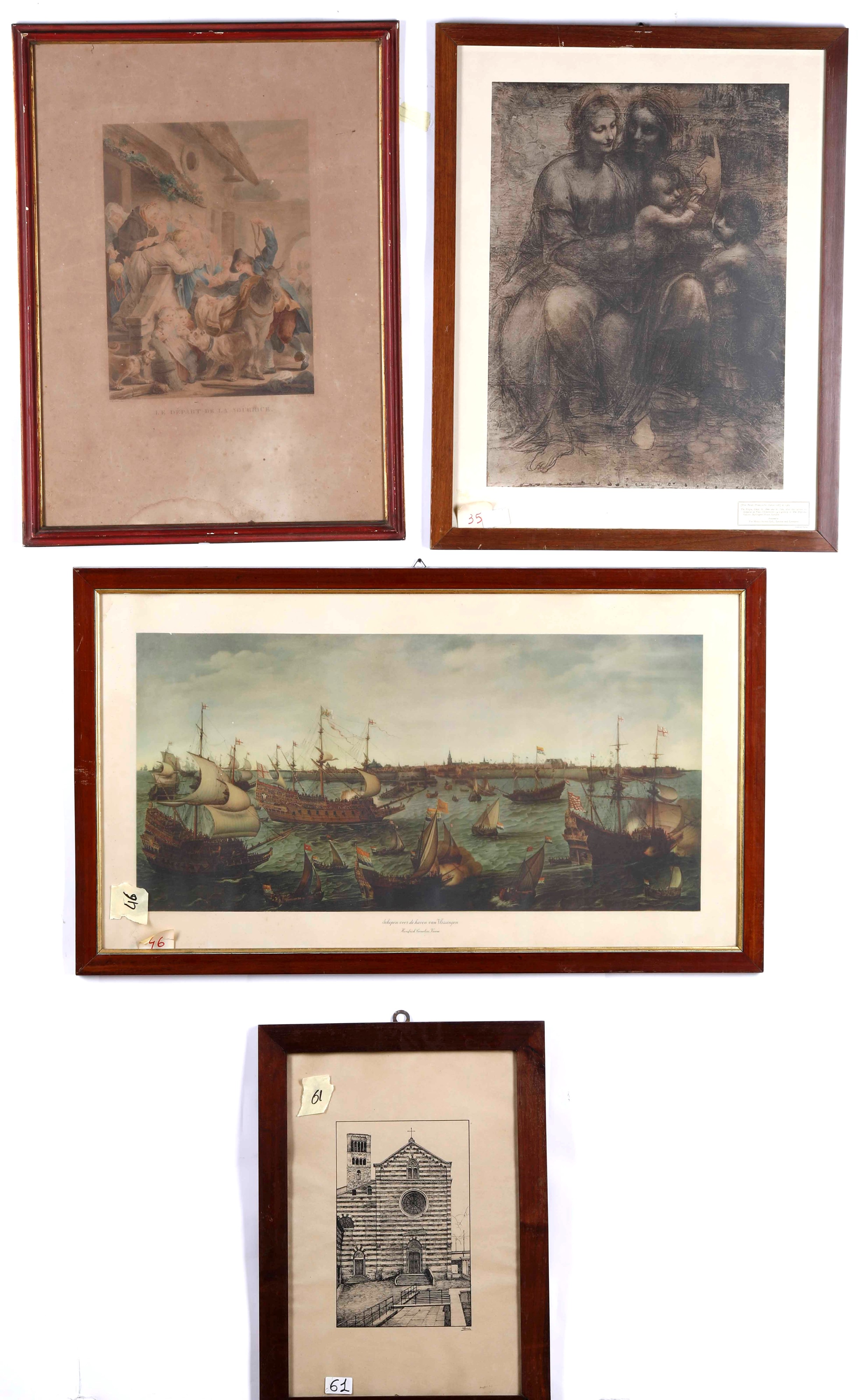 La Vergine e S. Anna da Leonardo Da Vinci, cm 64x49, Le depart de la Noivria, cm 63x45, Schepen voor de Leven von Vlessingen, cm 48x86, Chiesa di S.Stefano, cm 46x31. Bruniture. Proposte come stampe decorative