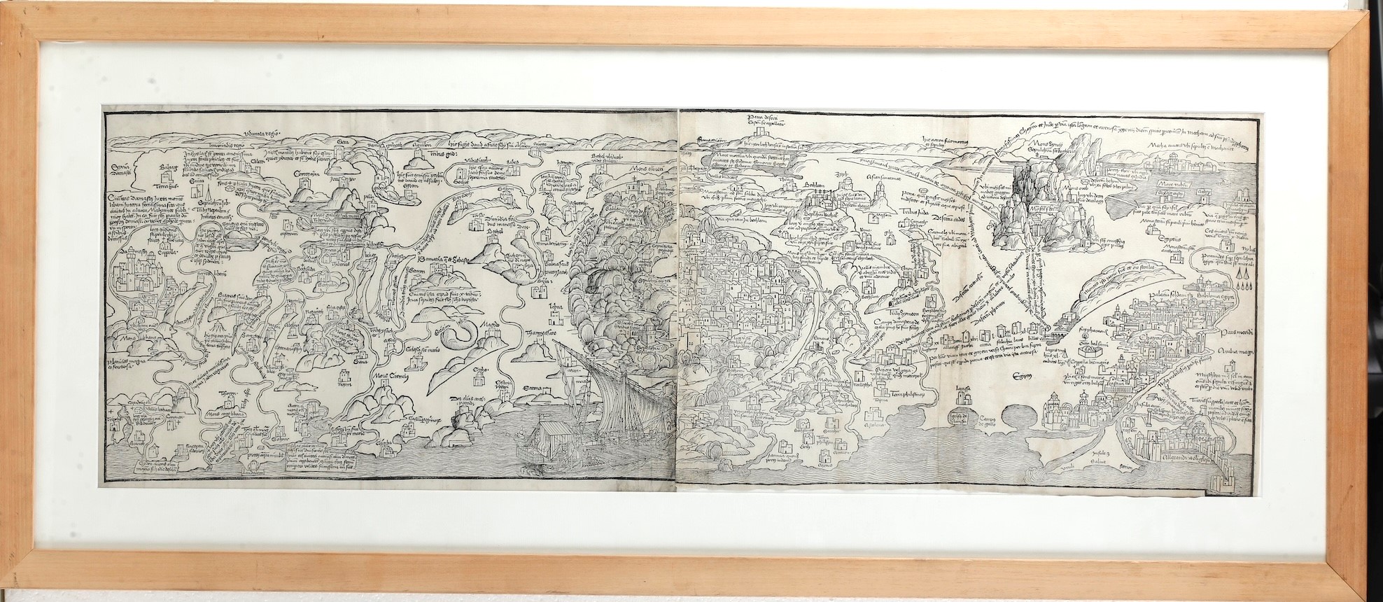 Bella mappa silografica della Terra Santa purtroppo mancante dei due fogli centrali. Dimensioni: foglio cm 86x28; cornice cm 101x43,5. Entro cornice moderna in legno