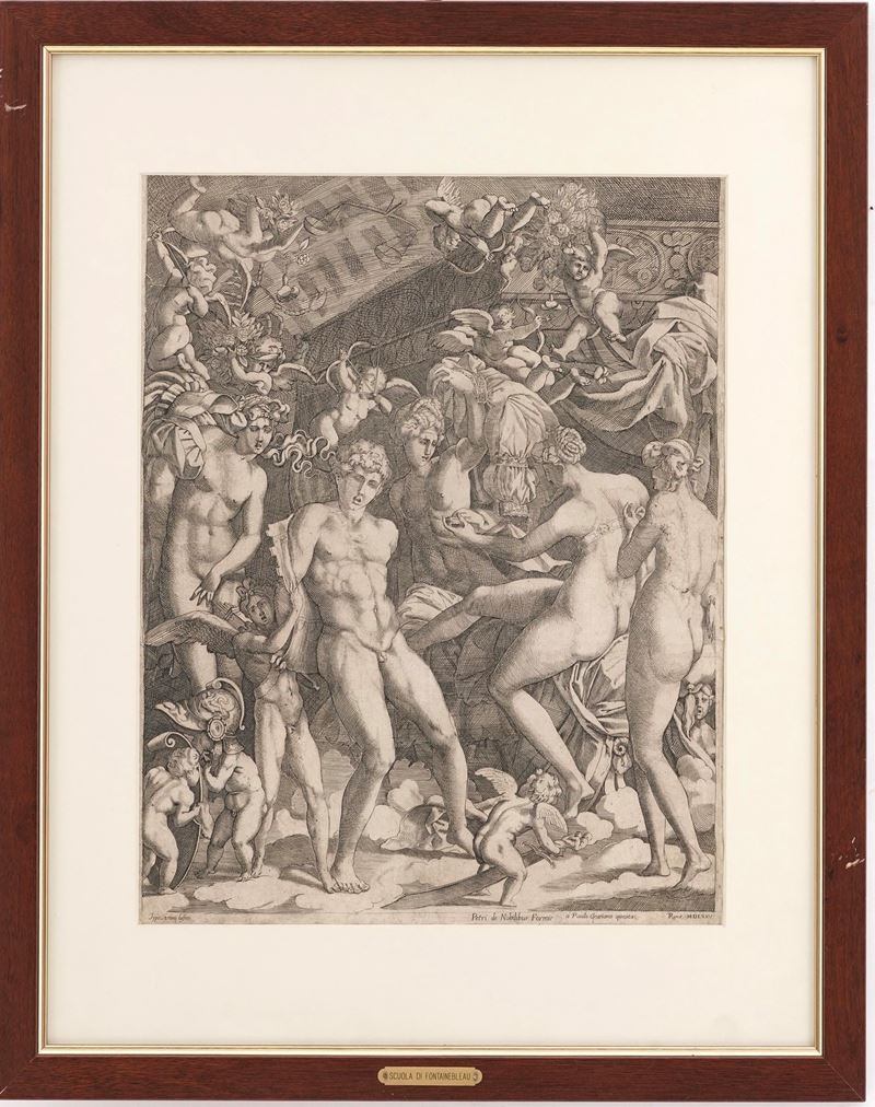 Incisione al bulino da un disegno preparatorio di Rosso Fiorentino. Il disegno di Rosso Fiorentino è conservato al Cabinet de desseins du Luvre. Buona prova di questo foglio assai complesso impressa su carta coeva con filigrana “agnello pasquale nel cerchio” “A.M”.