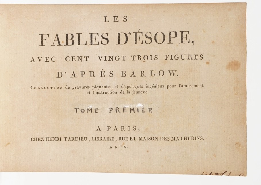 Esopo (620 a.C. ca. - 564 a.C.) Les Fables D'Esope avec cent vingt-trois figures d'apres barlow...a Paris, Chez Henri Tardieu, [..]