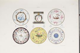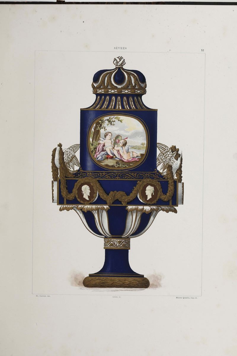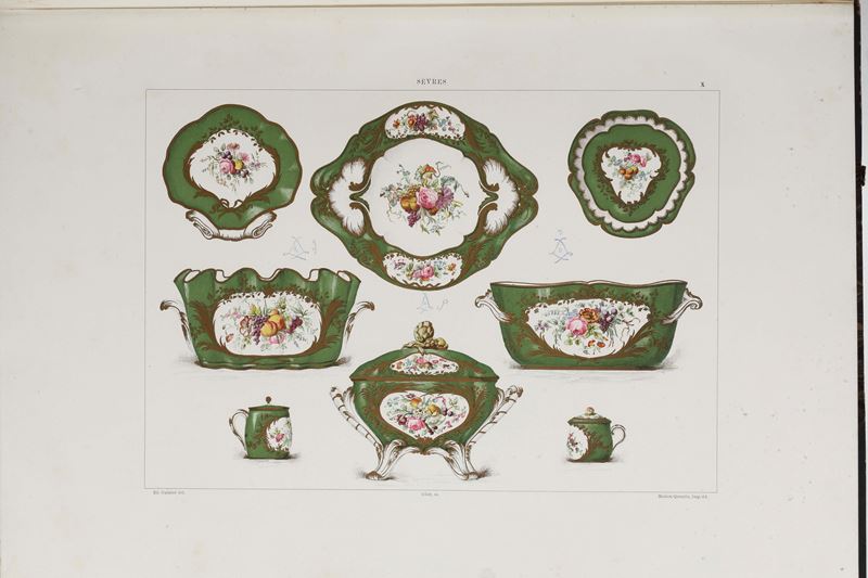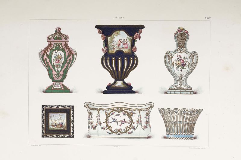 In-folio atlantico. (mm 443x338). Rilegatura in mezza pelle e punte del secolo XIX, piatti marmorizzati (usure in particolare a cerniere angoli e piccole fessurazioni). Opera completa delle cinquanta tavole a colori con riproduzioni e marchi di Sévres. Foxing