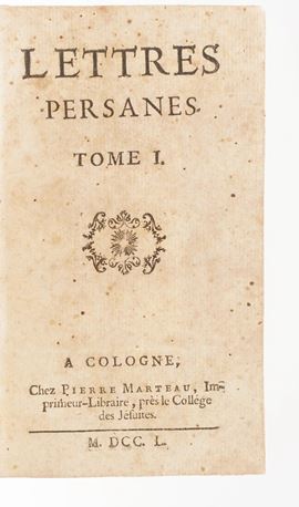 Montesquieu, Charles-Louis de Secondat (1689-1755) Lettres Persanes, A Cologne, Pierre Marteau, 1750-(1744). Due tomi rilegati insieme.