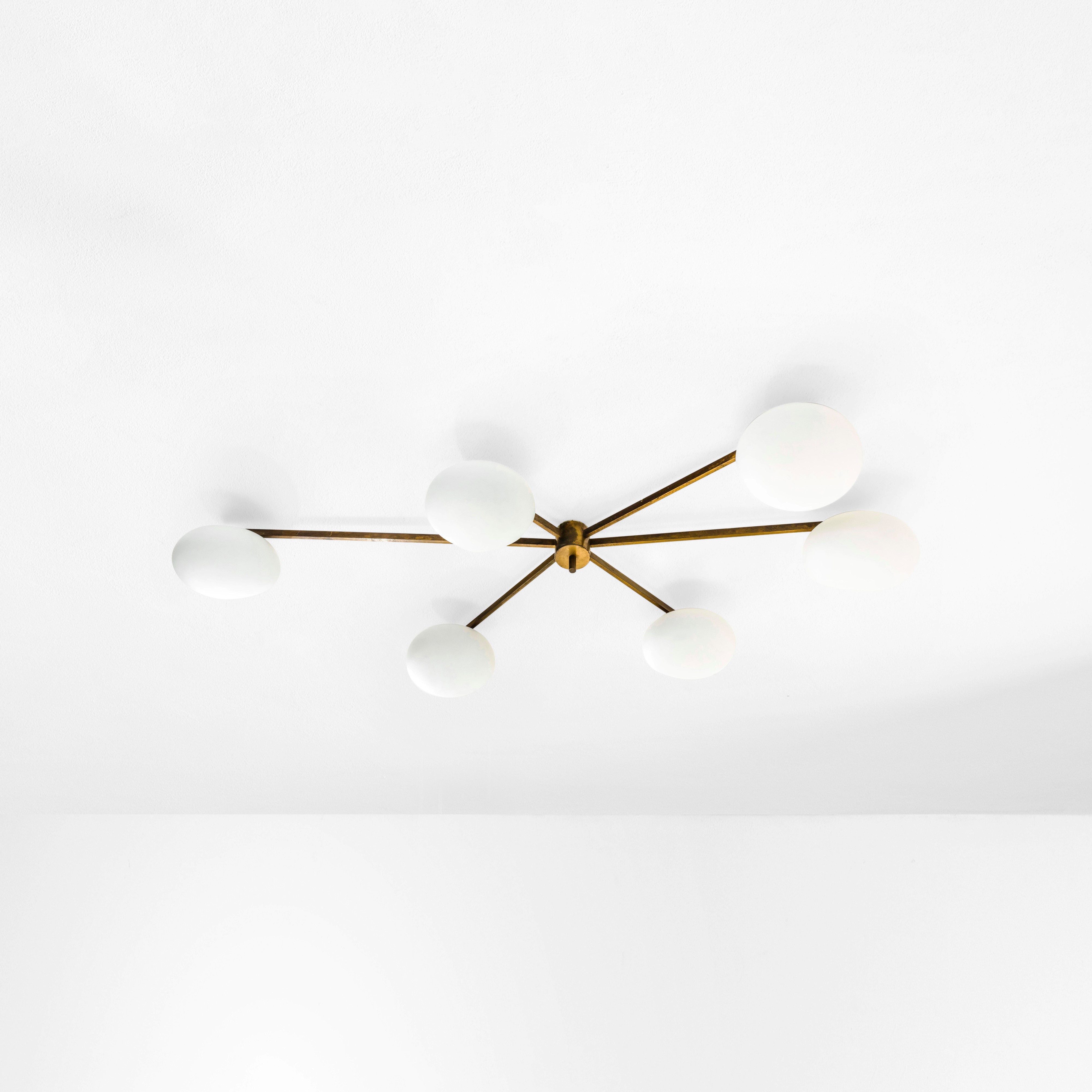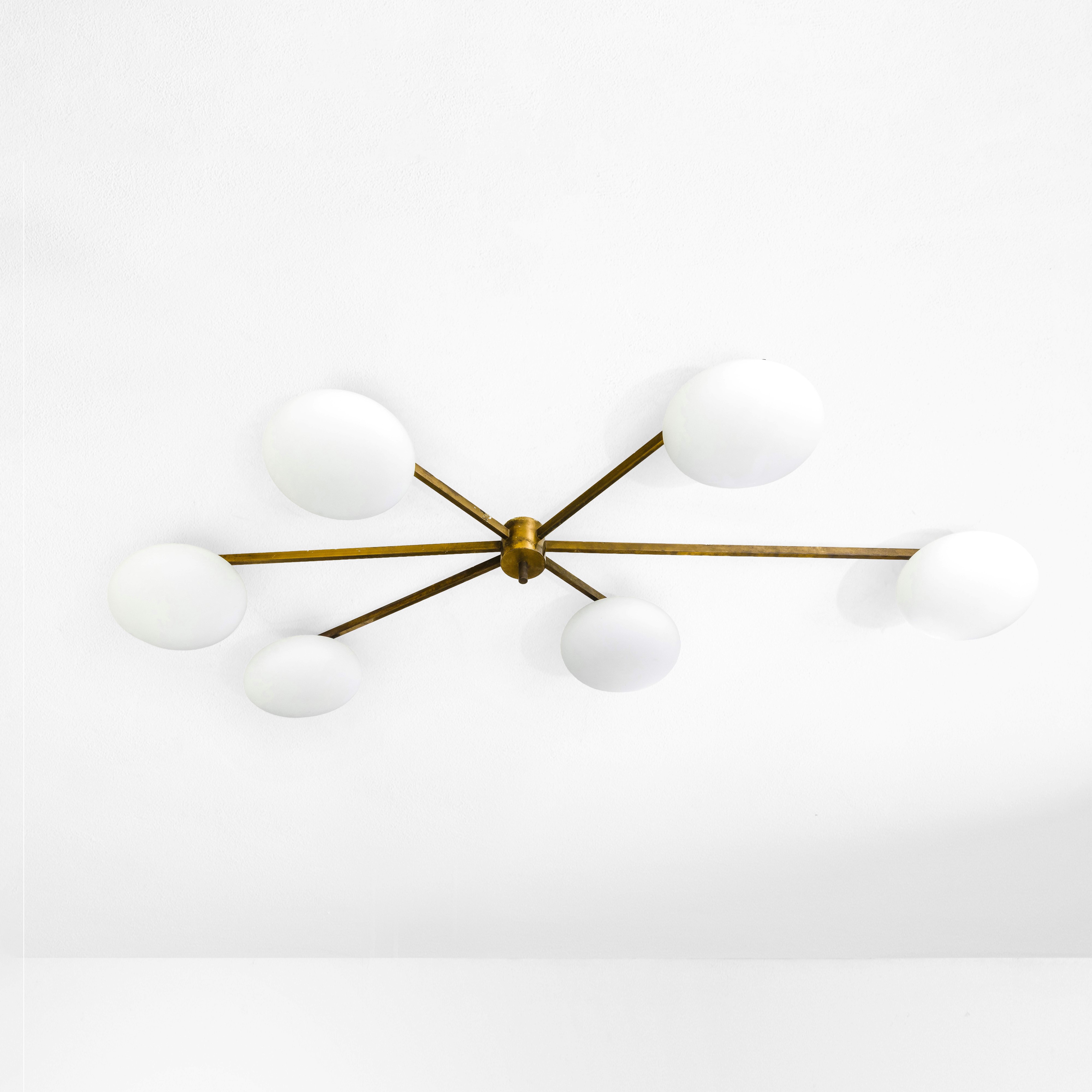 Struttura in ottone, metallo laccato e diffusori in vetro duplex opal bianco.
