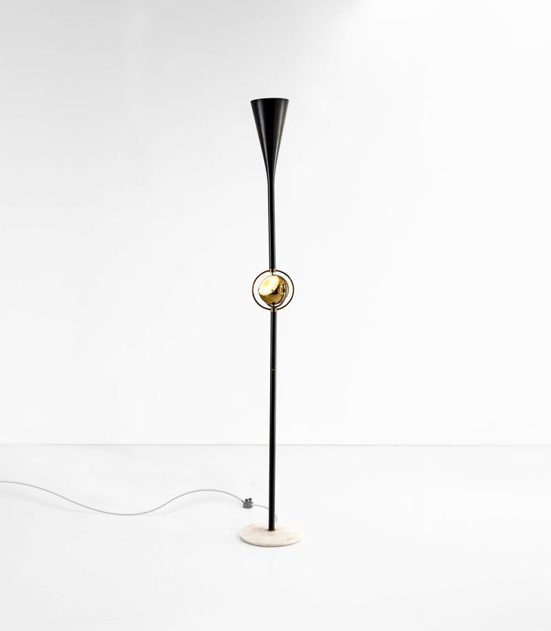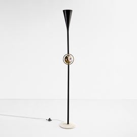 Struttura in metallo laccato e ottone. Proiettore orientabile lenticolare in ottone e perspex. Base in marmo.