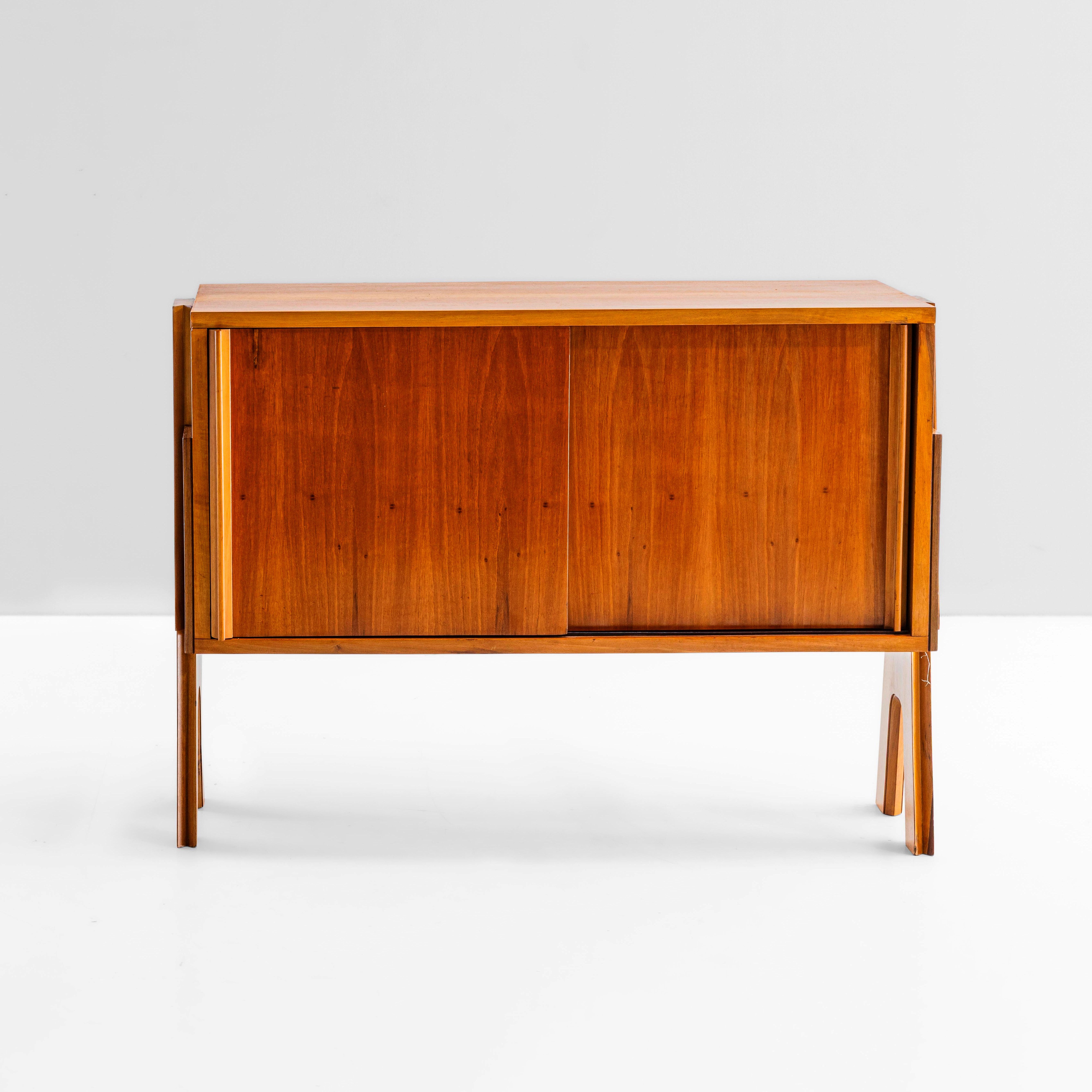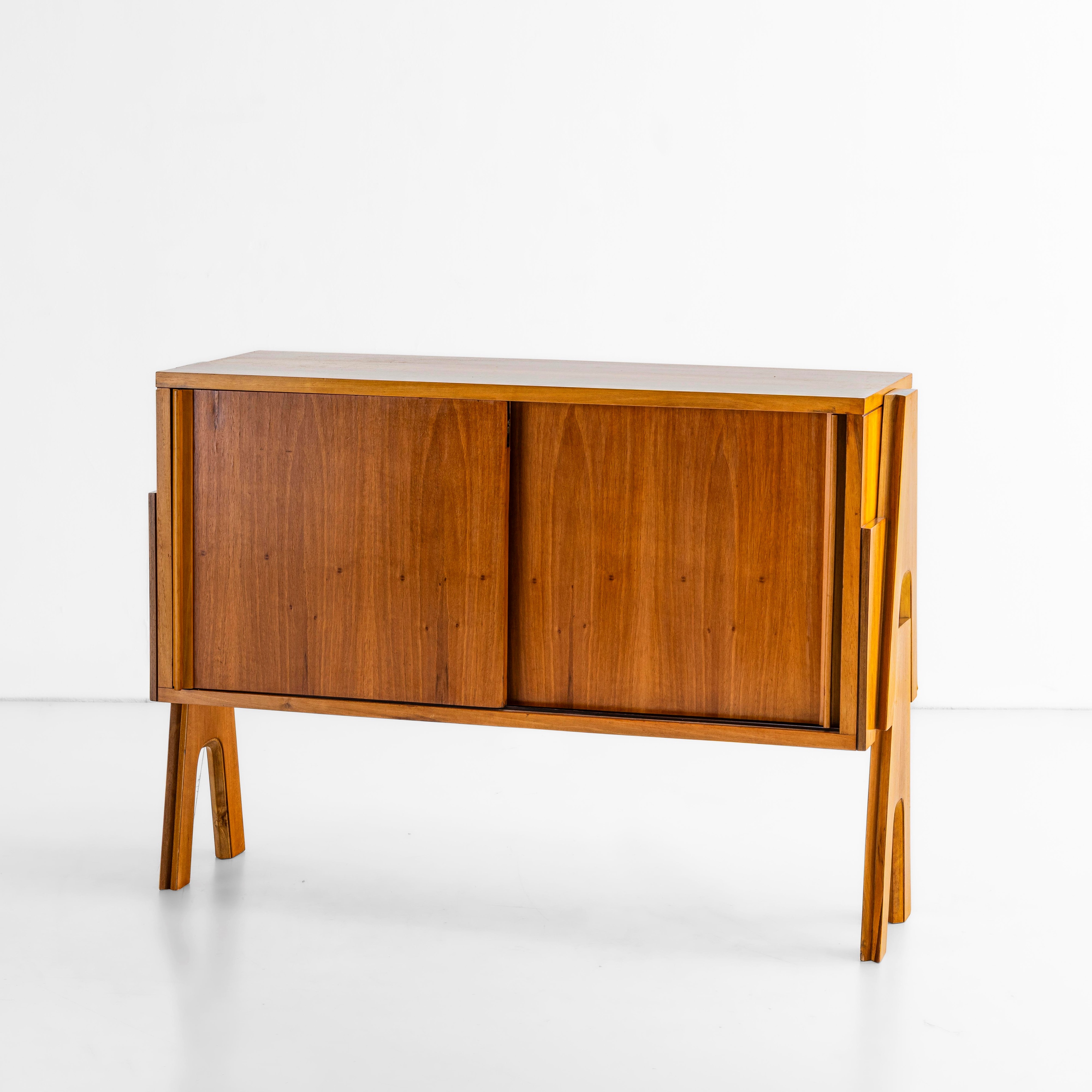 Struttura portante a cavalletto in legno e ante scorrevoli.
