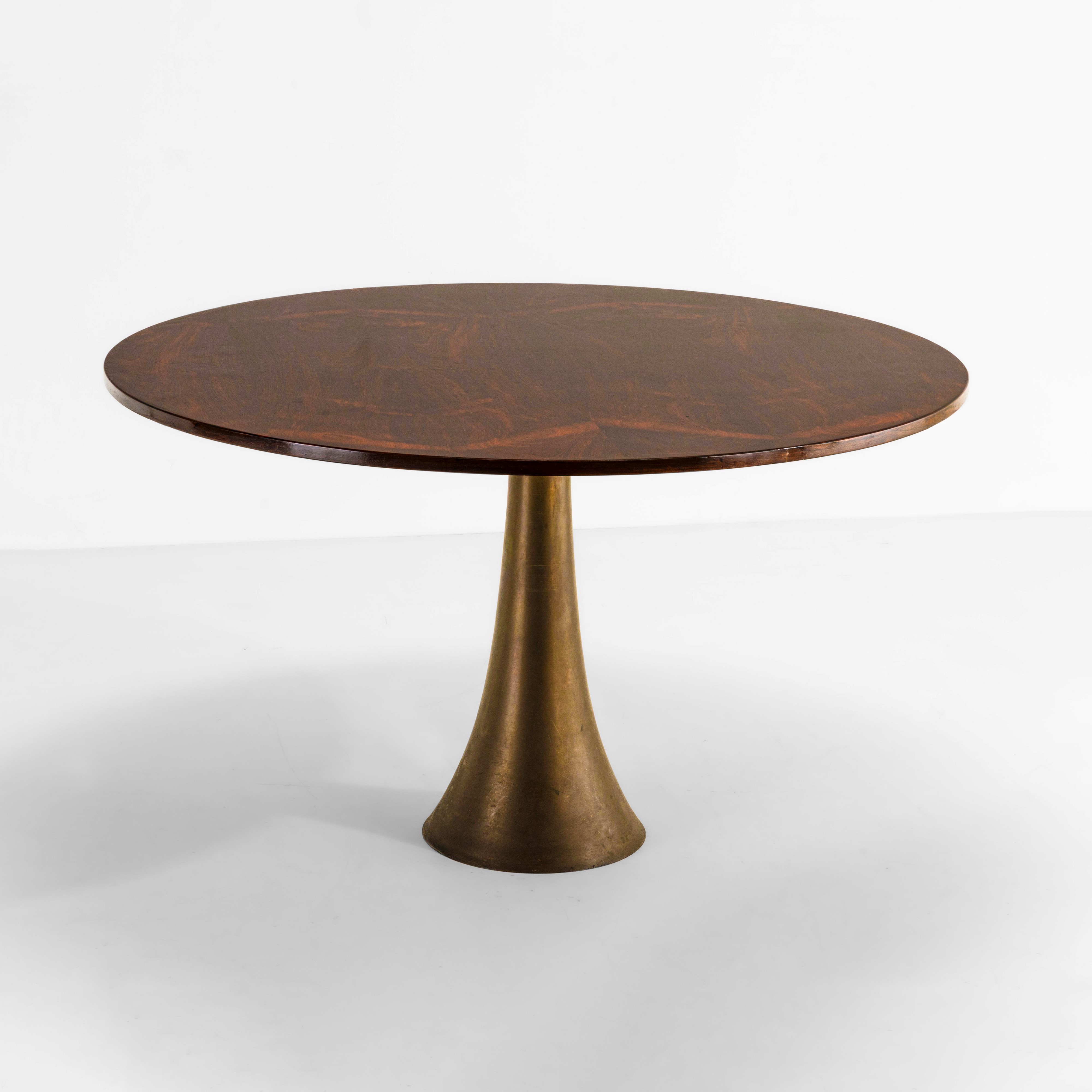 Base in fusione di bronzo finita al tornio e piano in legno impiallacciato.