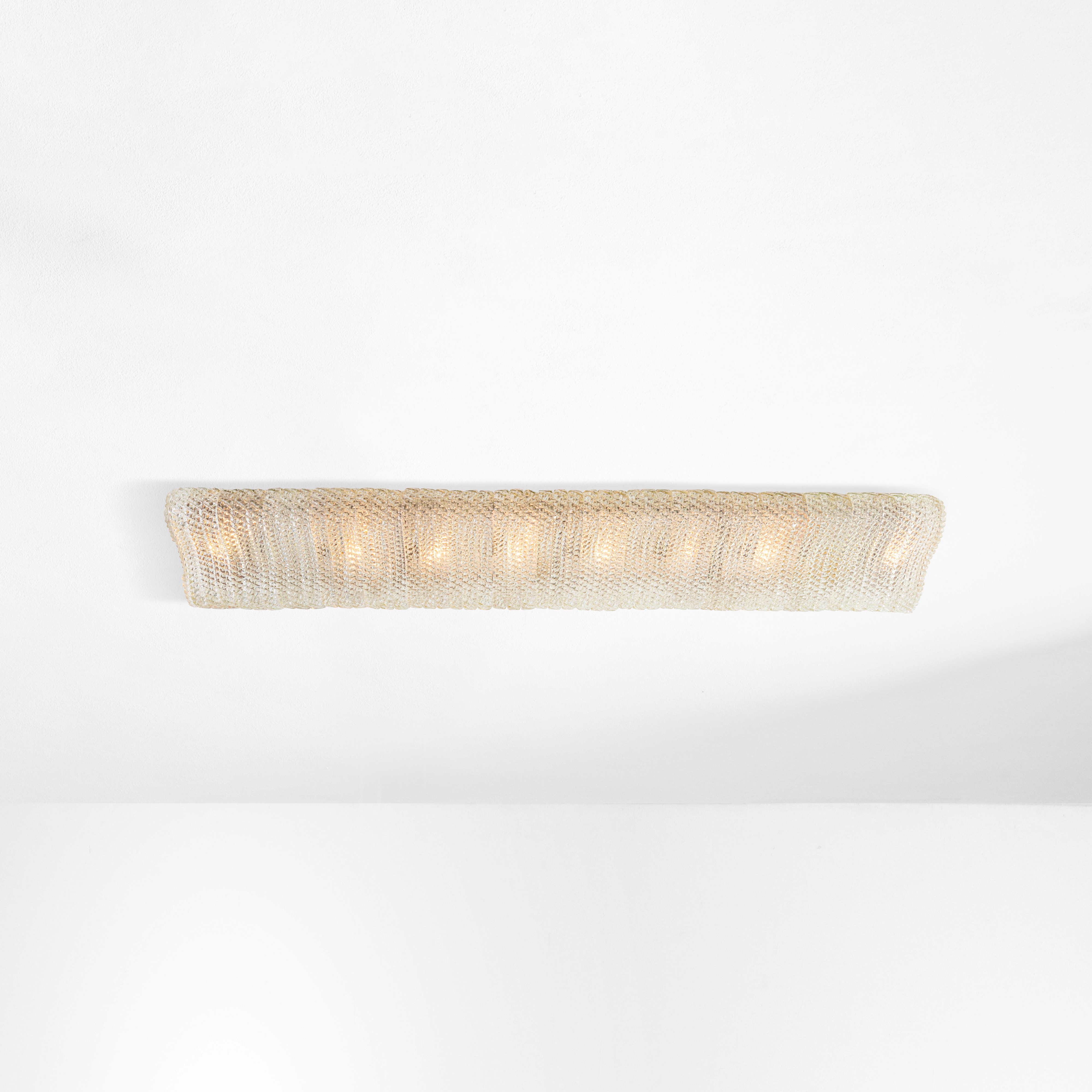 Struttura in metallo, diffusori in vetro di Murano cordonato. Dettagli in ottone.