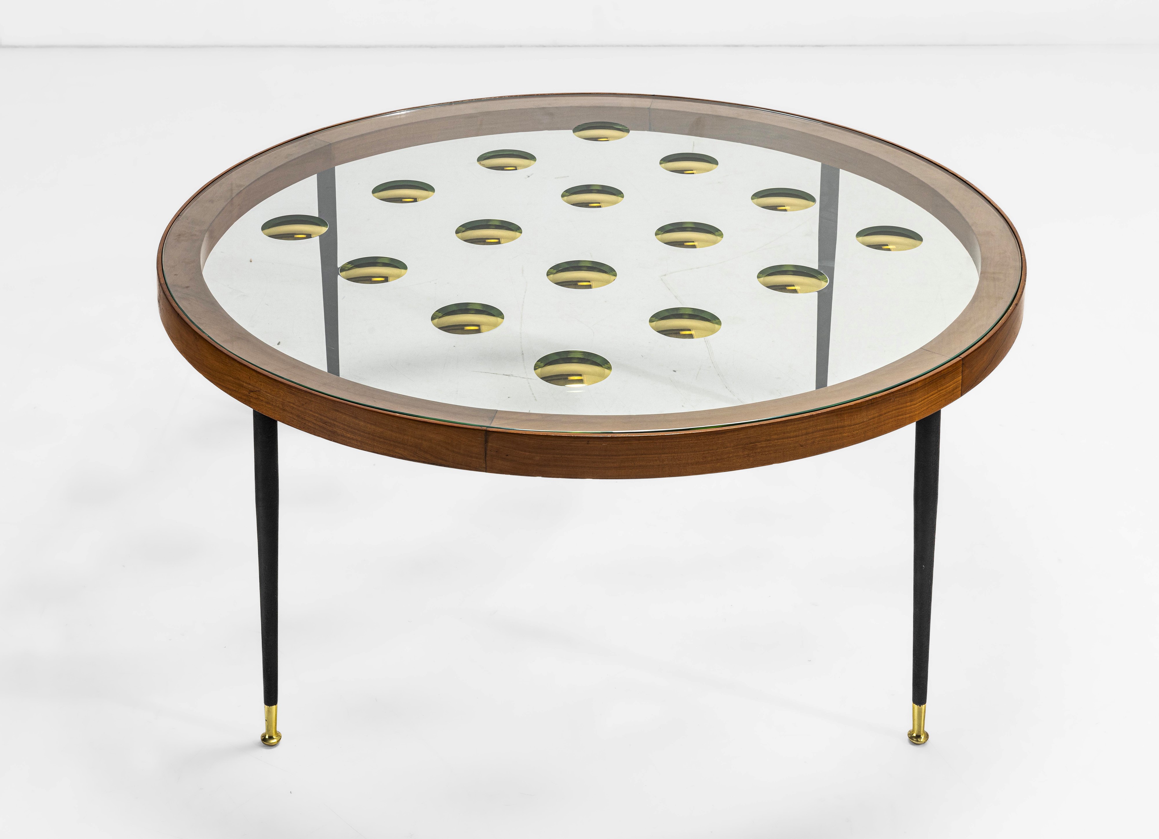 Struttura in metallo laccato e dettagli in ottone. Piano in cristallo inciso.