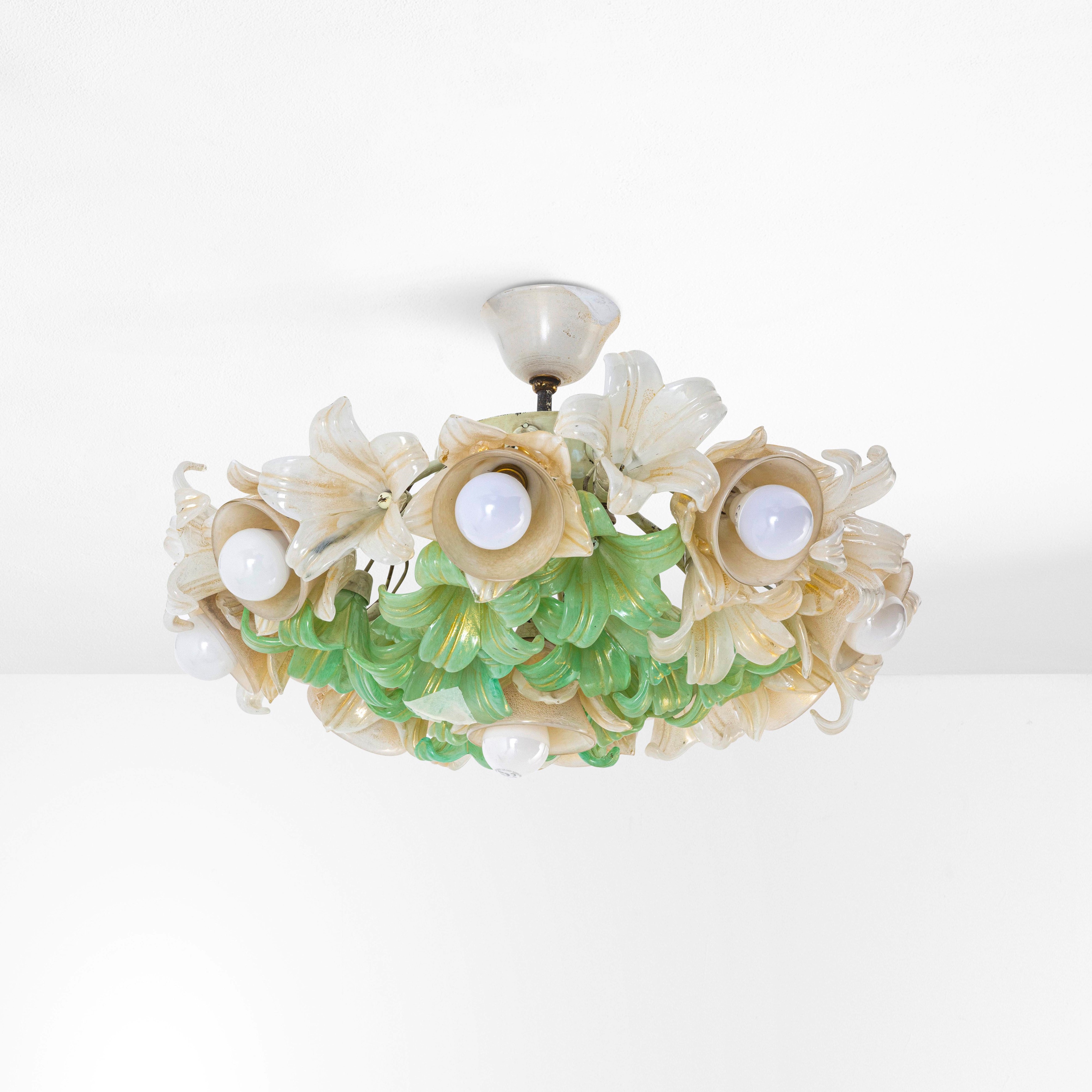 Struttura in ottone e elementi diffusori in vetro di Murano colorato.