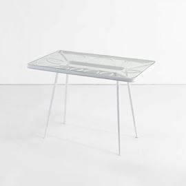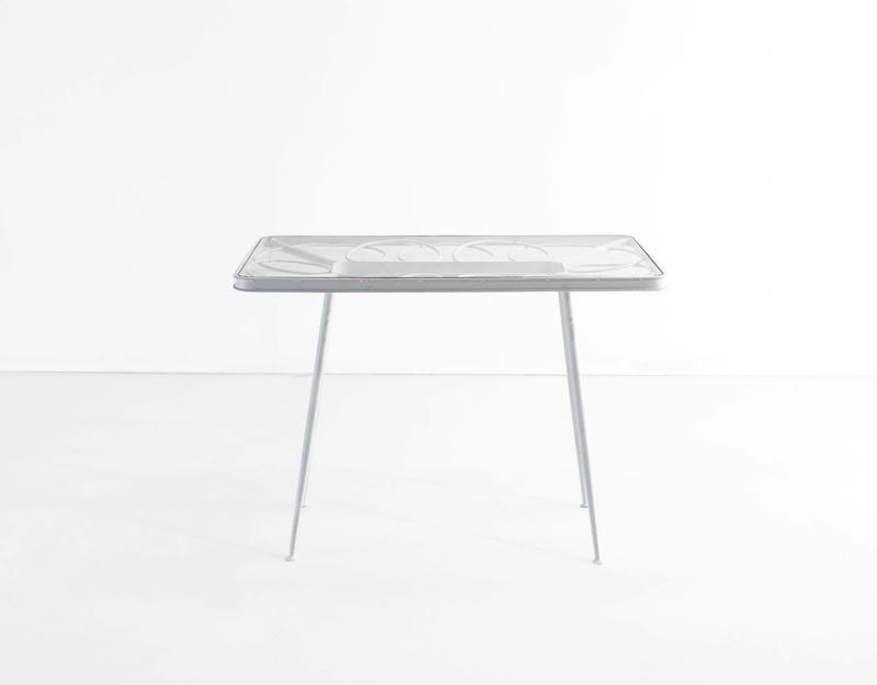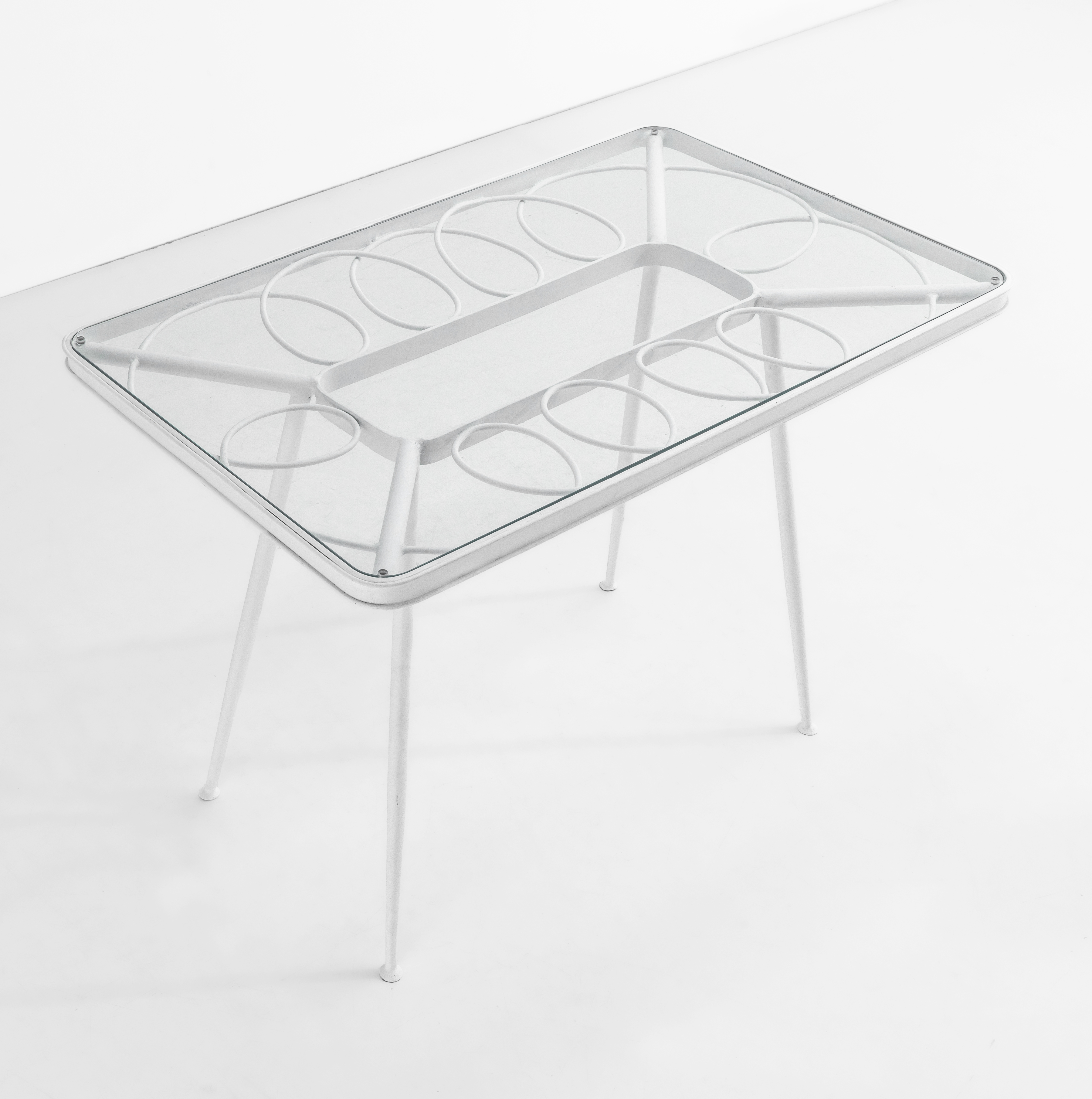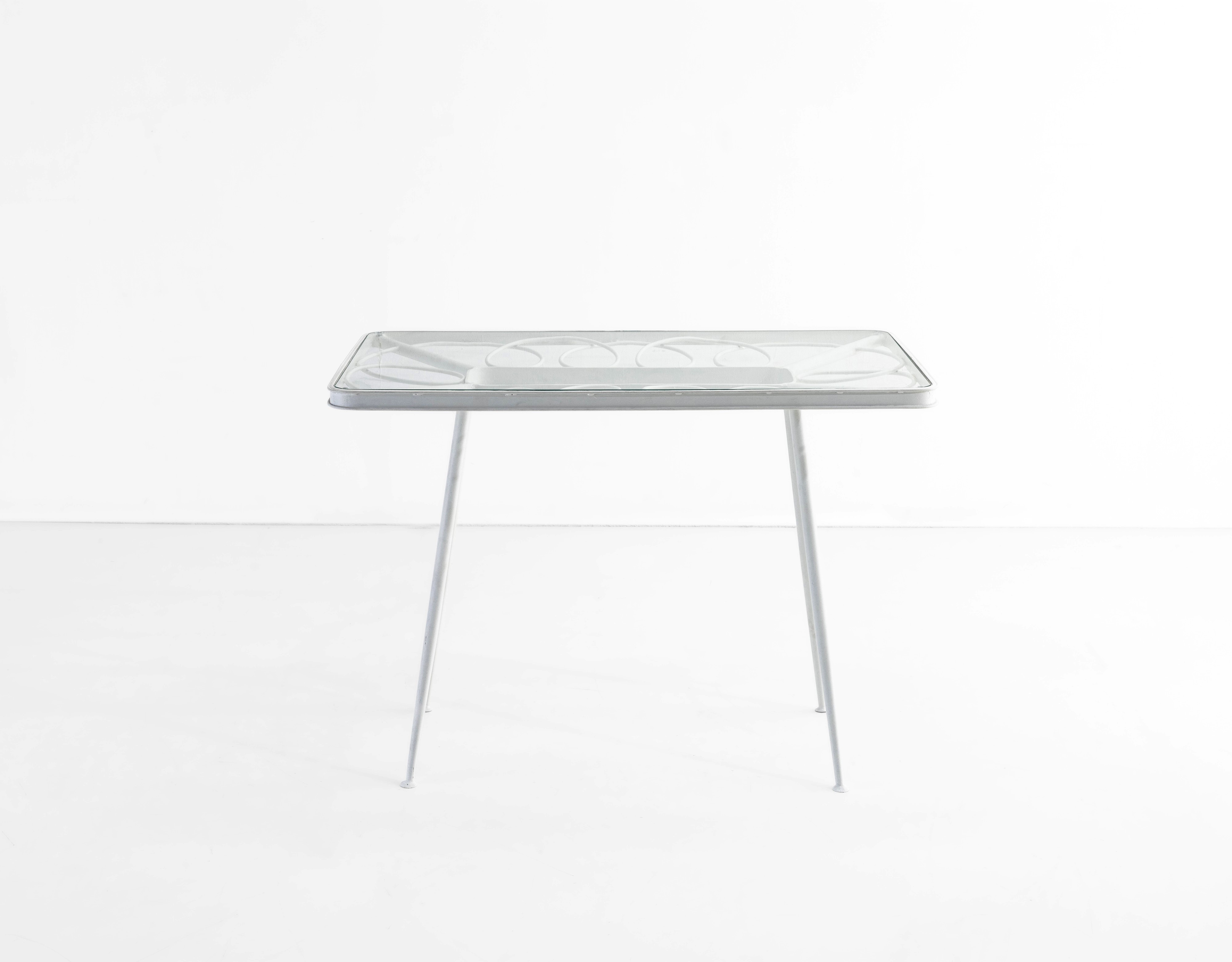 Struttura in tubolare di ferro laccato e piano in vetro.