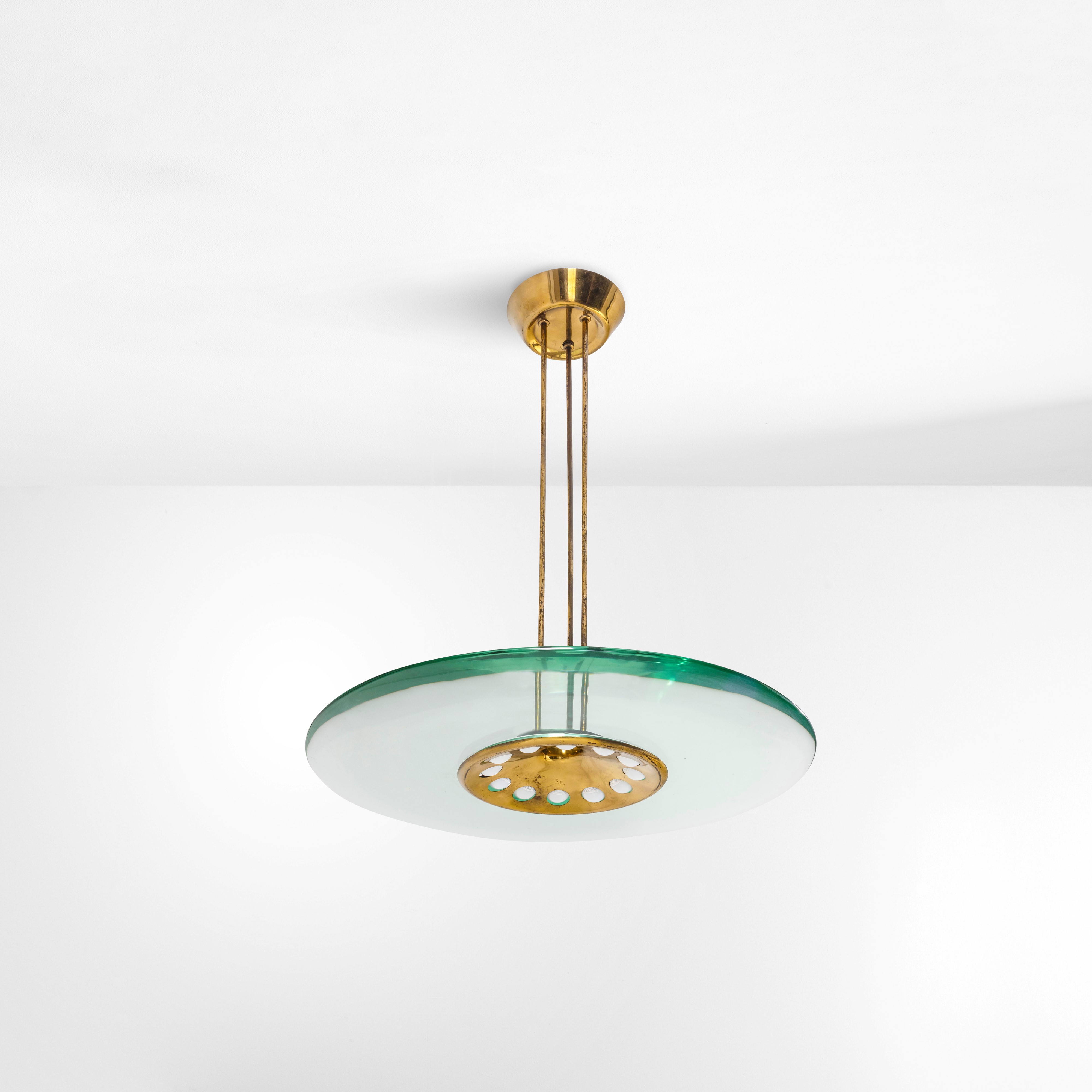 Struttura in ottone e grande disco diffusore in cristallo lenticolare molato di forte spessore.