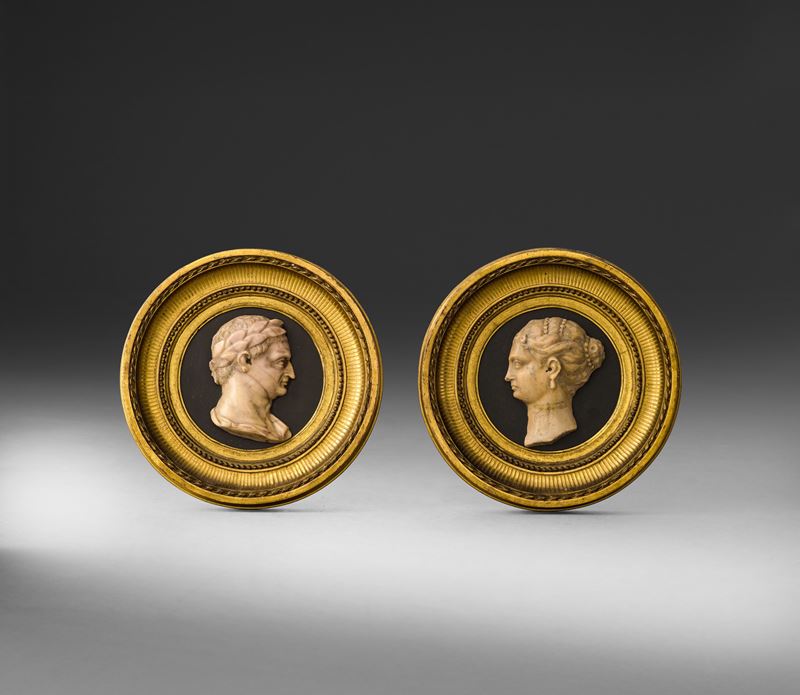 Coppia di profili raffiguranti l'imperatore Claudio e l'imperatrice Valeria Messalina. Arte neoclassica italiana (Roma?), [..]