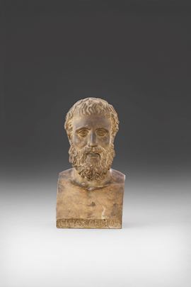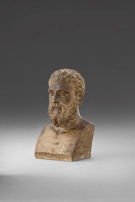 Come spiega Stefano Grandeso nella scheda descrittiva che accompagna l'opera la stessa deriva da un prototipo classico appartenuto, come testimonia l'iscrizione a lato, a Josè Nicolas de Azara, marchese di Nibbiano (1730-1804) "..a lungo ministro plenipotenziario spagnolo a Roma, ma anche celebre collezionista, mecenate e letterato, biografo di Anton Raphael Mengs e promotore della riedizione delle opere di Johann Joachim Winckelmann. De Azara raccolse infatti una collezione di ritratti di filosofi e uomini illustri greci che donò al Re di Spagna Carlo III di Borbone e che ora è conservata al Prado"