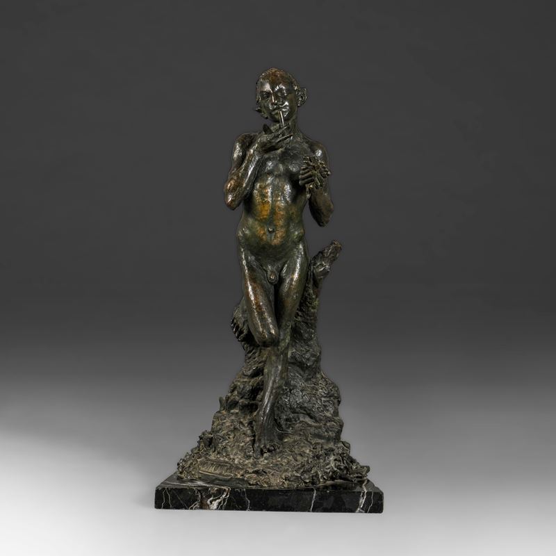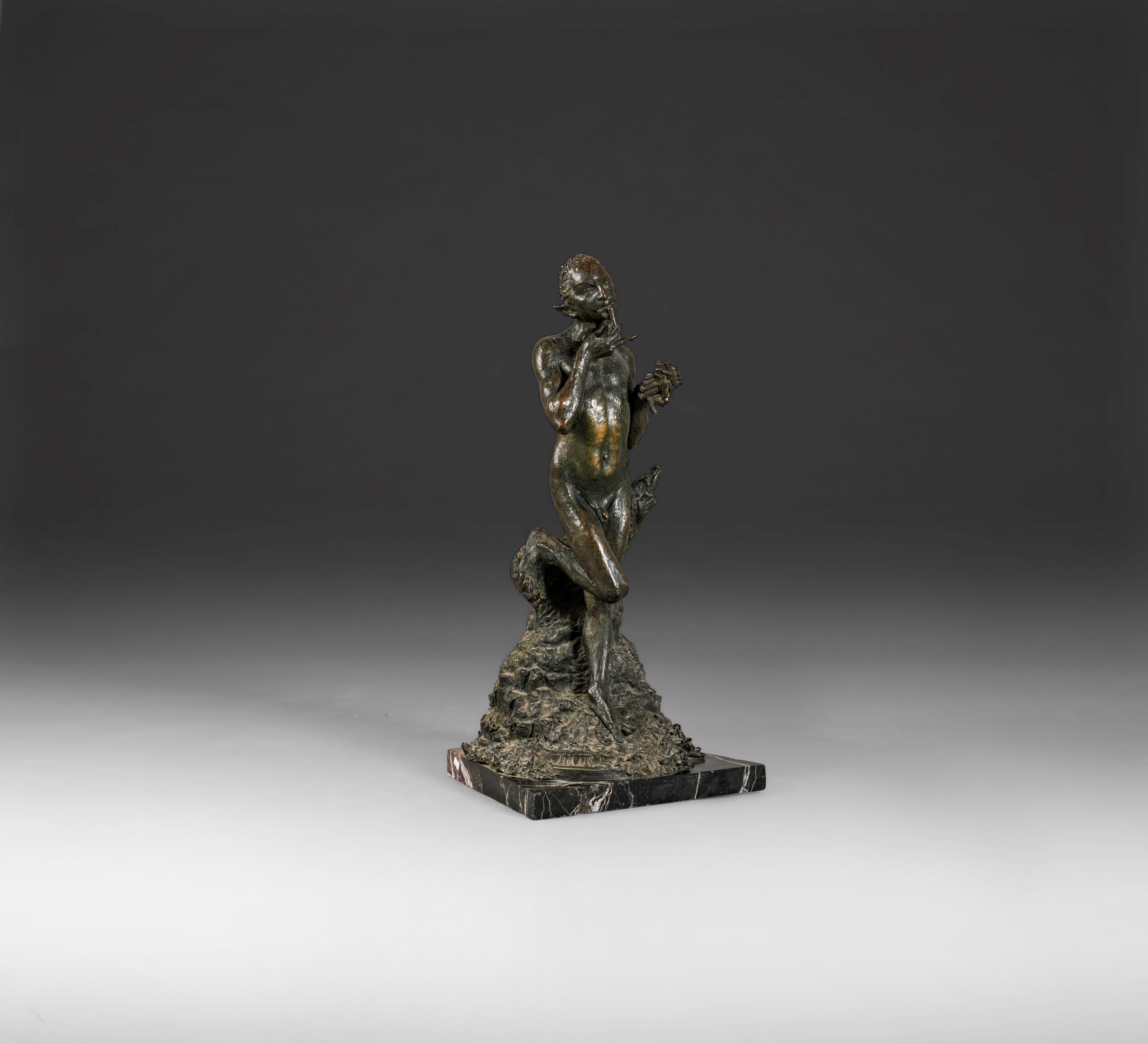 L'opera raffigurante un giovane satiro che, nudo, appoggiato ad una roccia prova il suono di una canna del suo flauto di Pan, appartiene alla produzione di bronzi tra Ottocento e Novecento di ispirazione classica o mitologica. L'alta qualità artistica dell'opera, seppur priva di firma dell'autore, la sua resa stilistica la avvicinano alle produzioni di importanti maestri come Vincenzo Gemito (Napoli 1852-1929) e Giulio Aristide Sartorio (Roma 1870-1932)