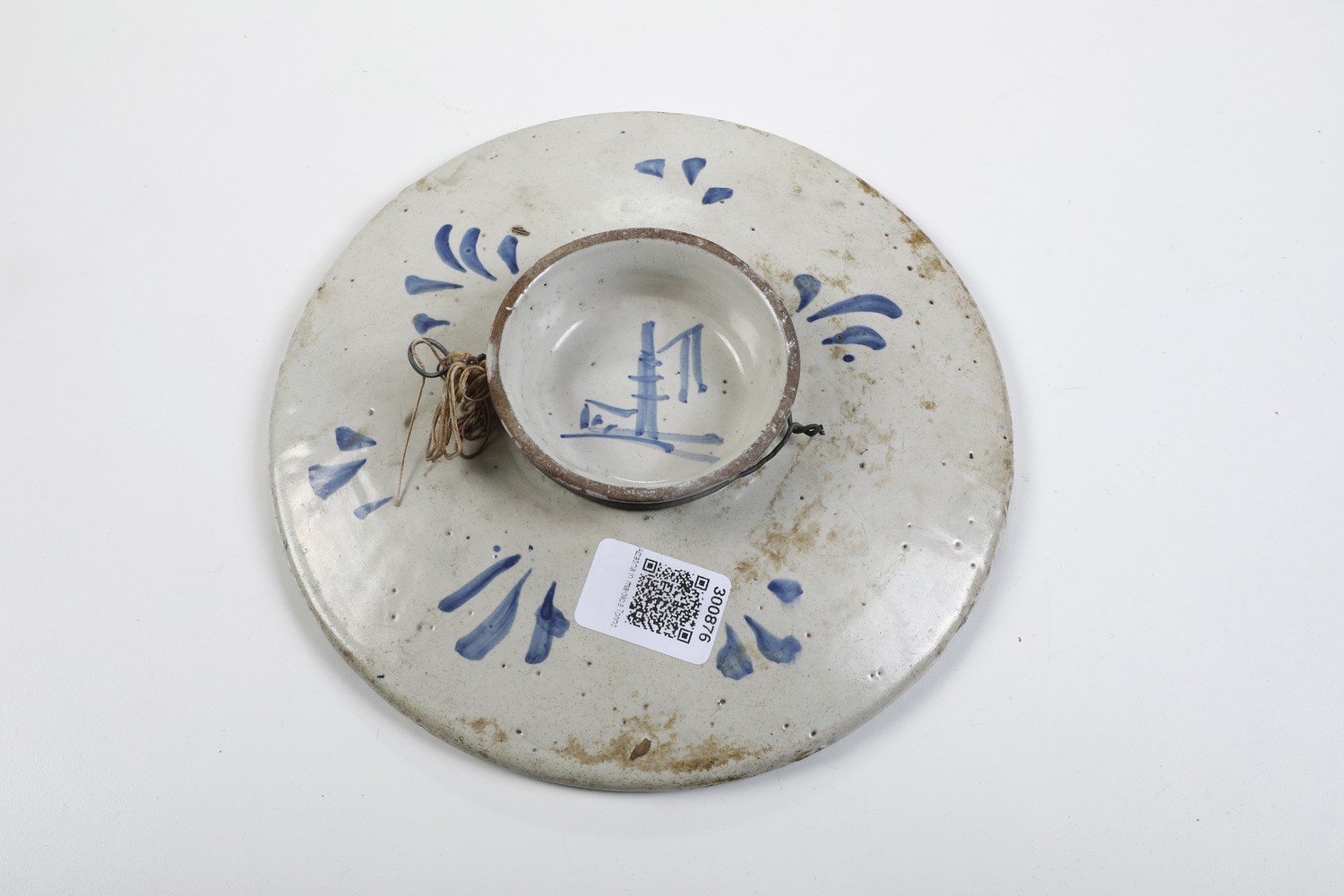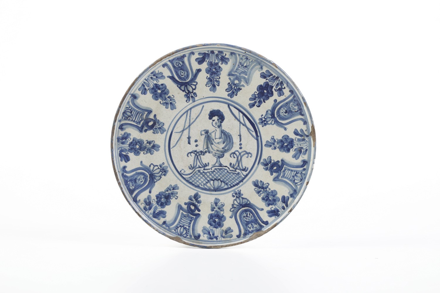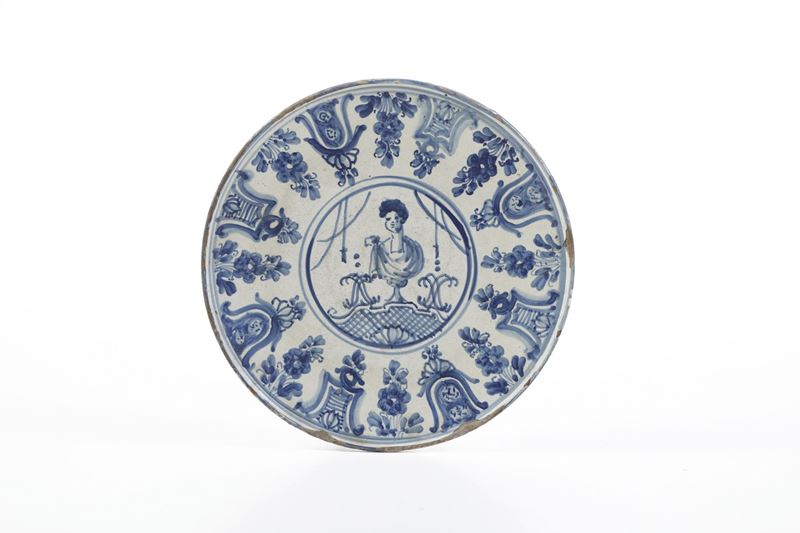 Maiolica. Marca: lanterna in blu. Dimensioni: altezza cm 4; diametro cm 22. Conservazione: piccole sbeccature al bordo.