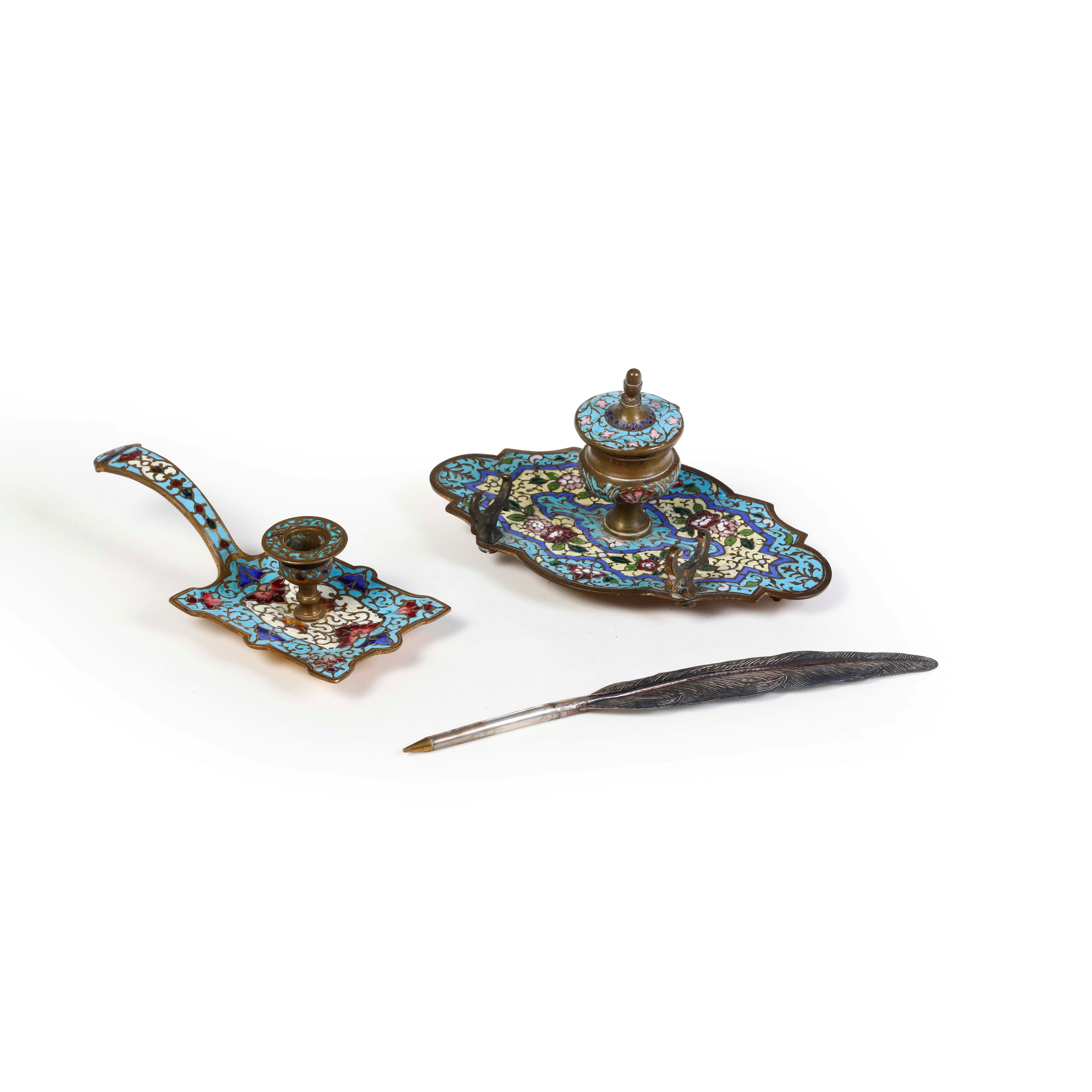 Calamaio e bugia in metallo smaltato in policromia. Russia, fine XIX secolo