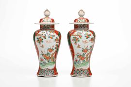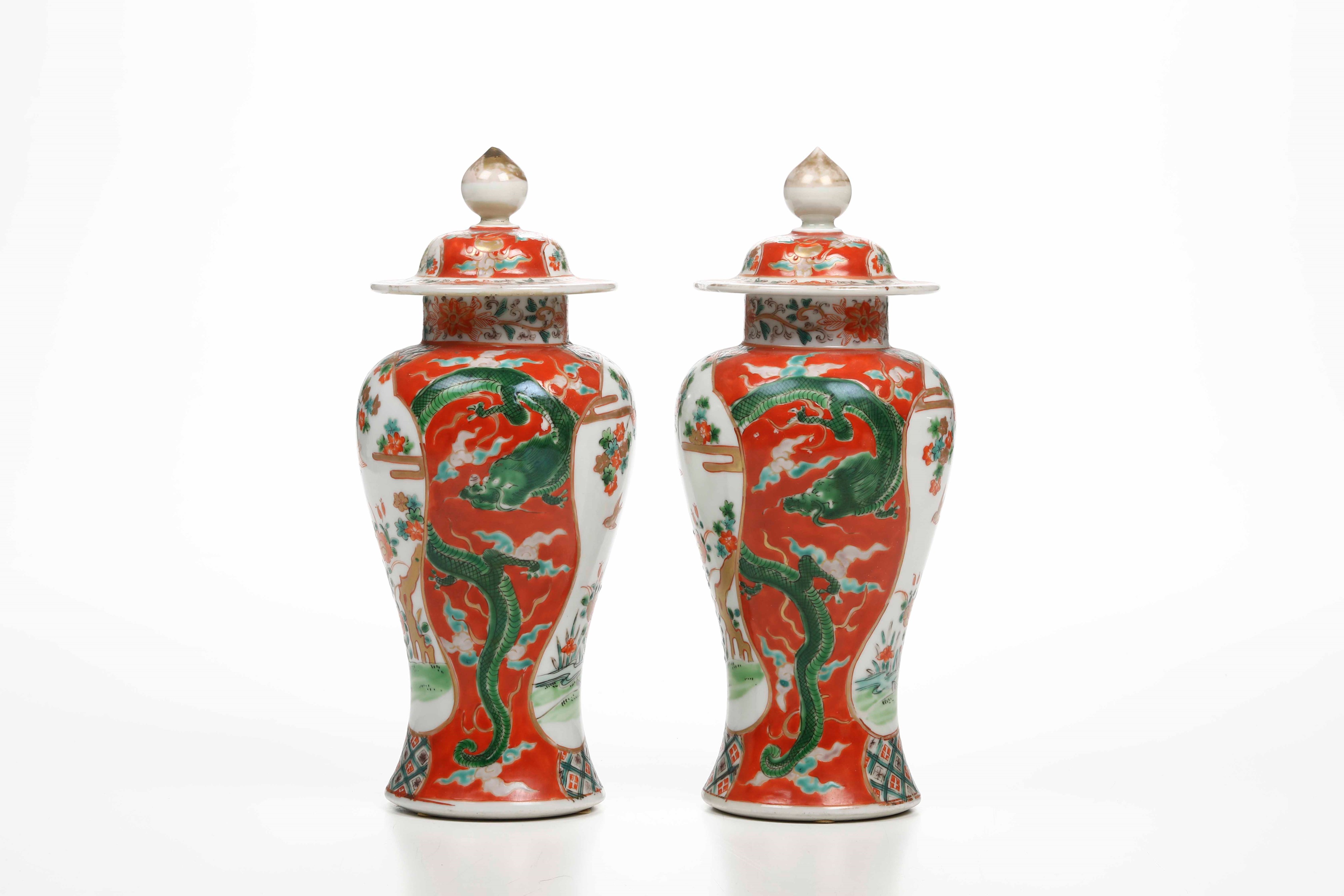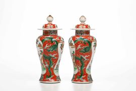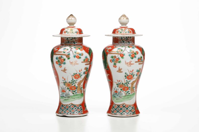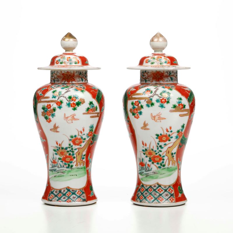 Coppia di potiches in porcellana nei toni della Famiglia Verde con decori naturalistici entro riserve, Cina, Dinastia Qing, [..]