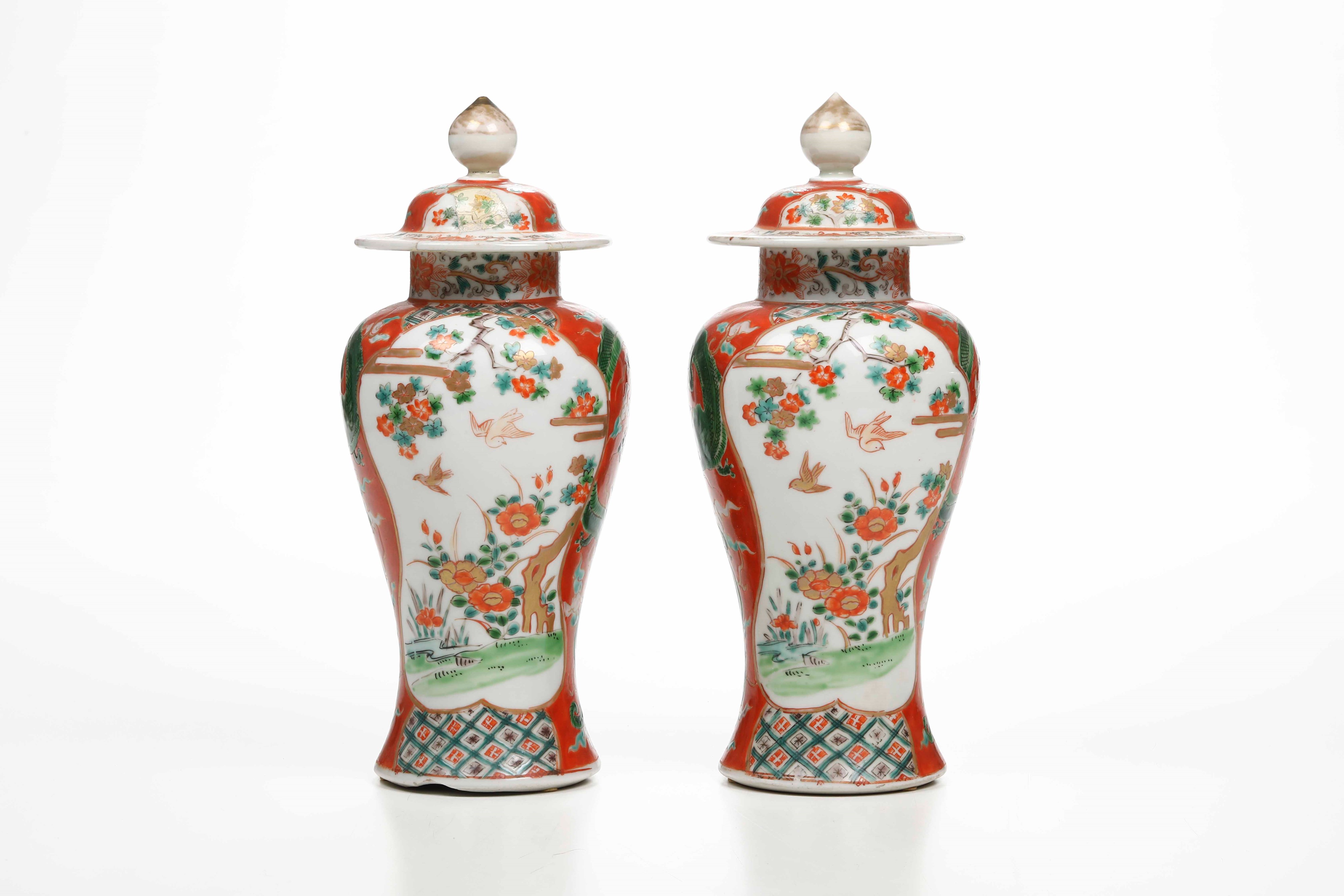 Coppia di potiches in porcellana nei toni della Famiglia Verde con decori naturalistici entro riserve, Cina, Dinastia Qing, XIX secolo