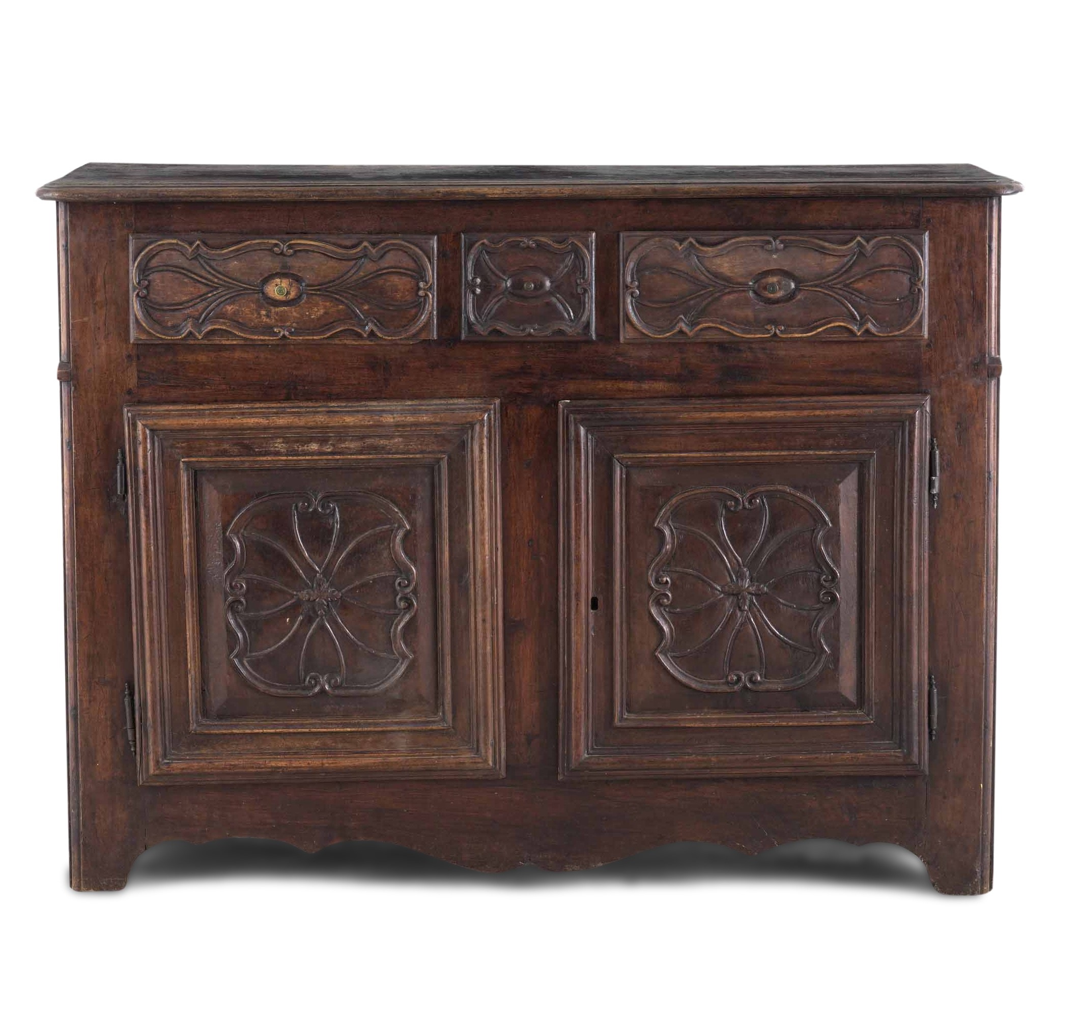 Fronte con due ante e tre cassetti pannellati e decorati con intaglio a ragnatela