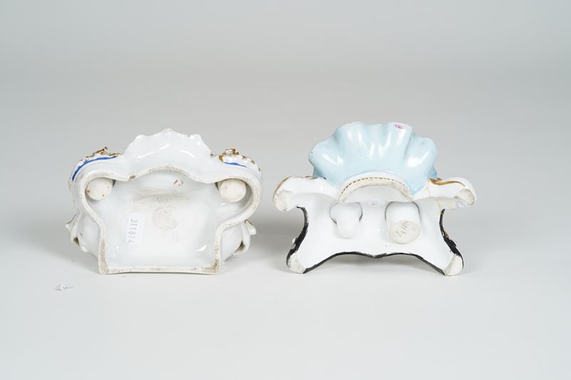 Porcellana. Altezza massima cm 10,5 circa. Conservazione: buona; uno servizio presenta un'estesa sbeccatura; un'altro ha la parte terminale del piede rotta e incollata; piccole sbeccature e mancanze minori
