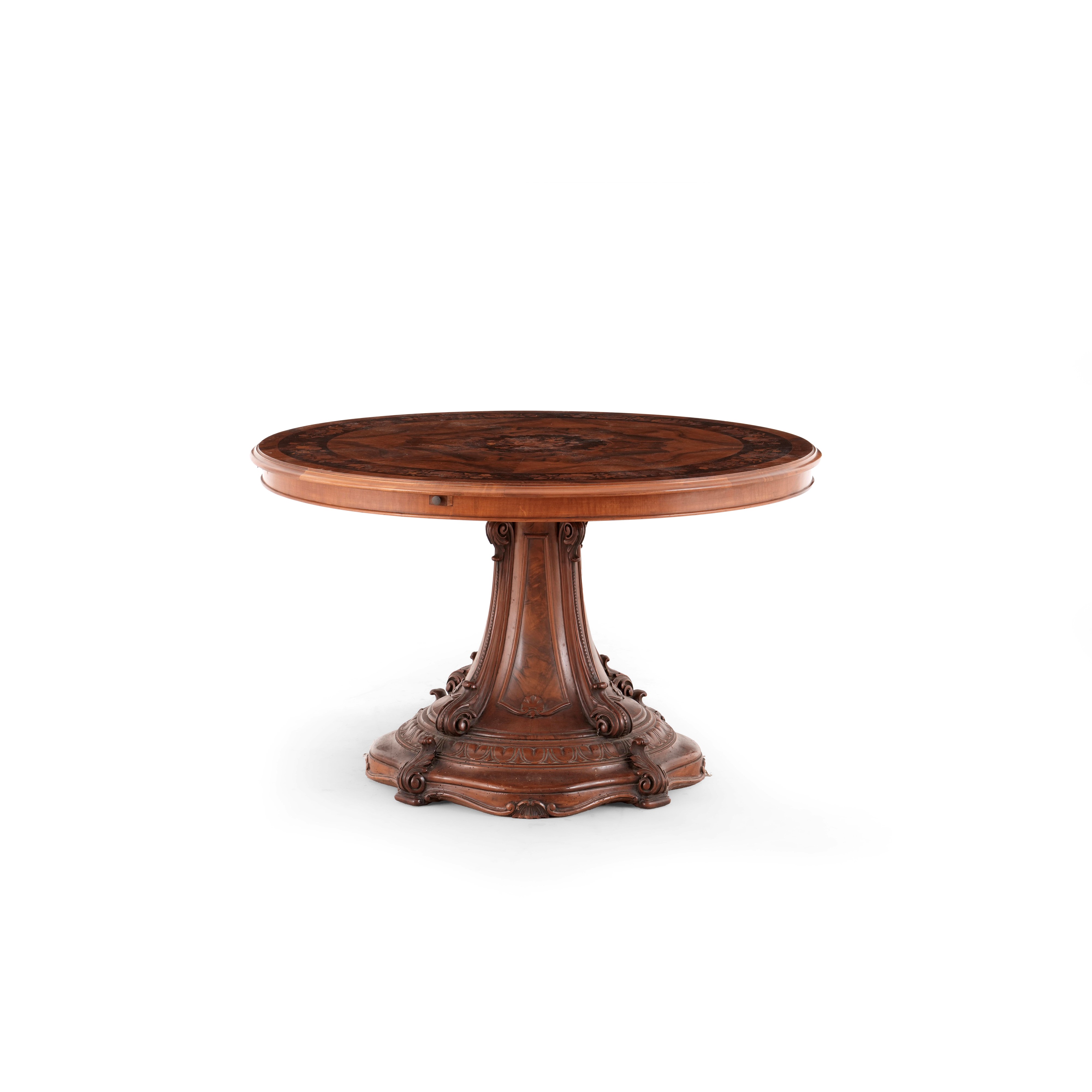 Tavolo circolare in lagno intagliato, lastronato ed intarsiato. XIX secolo