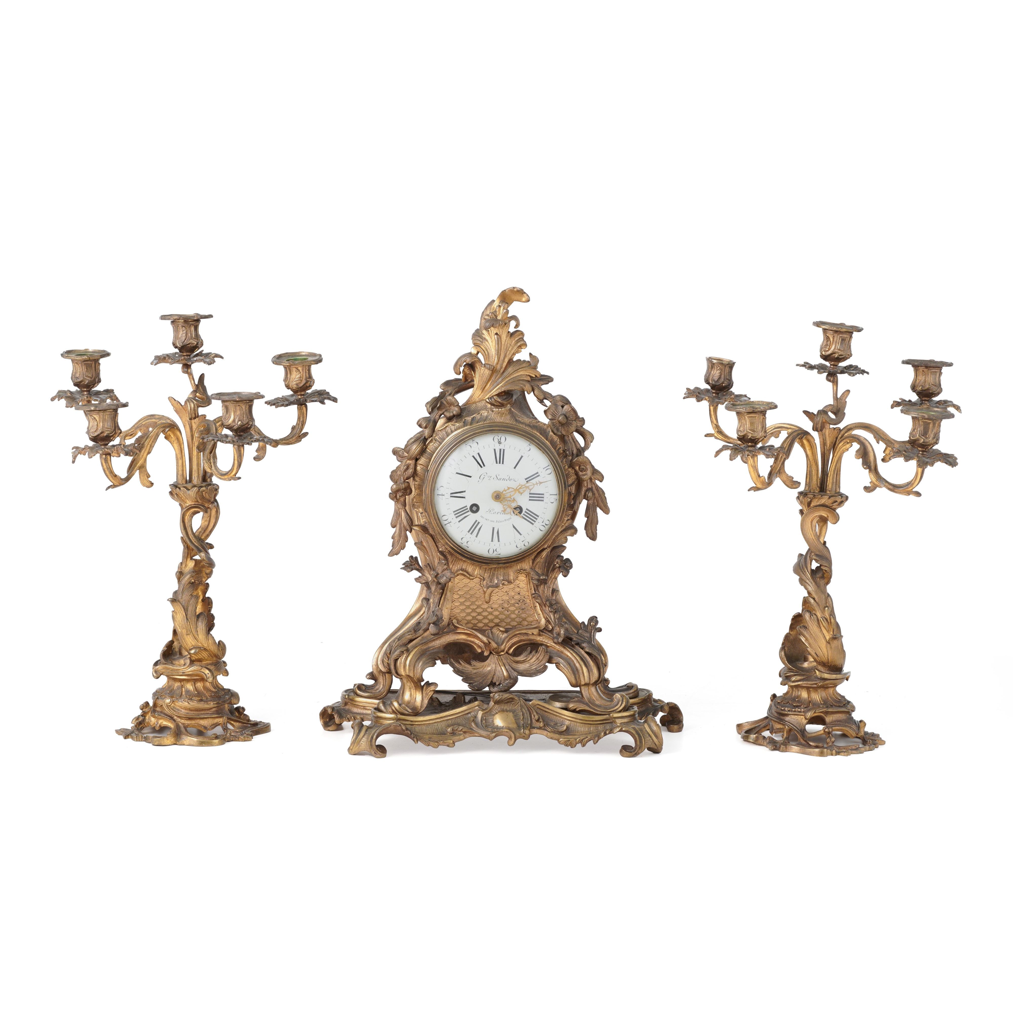 Composto da una pendola e una coppia di candelieri a cinque fiamme. Decori rocaille con elementi fitomorfi, quadrante in smalto bianco con ore in numeri romani e minuti in numeri arabi firmato "G.ve Sandoz Paris"