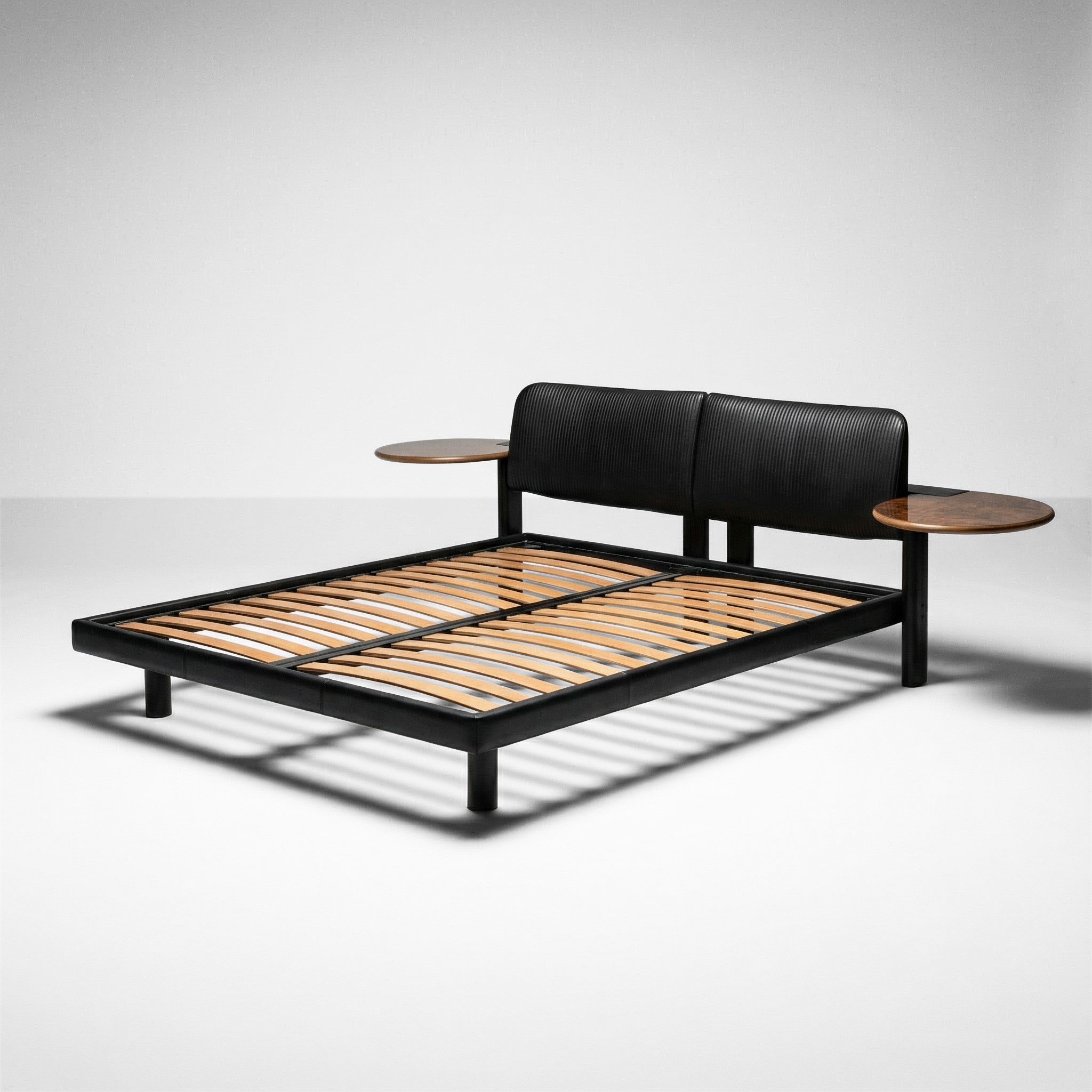 Struttura in metallo laccato, legno in diverse essenze e rivestimento in cuoio.