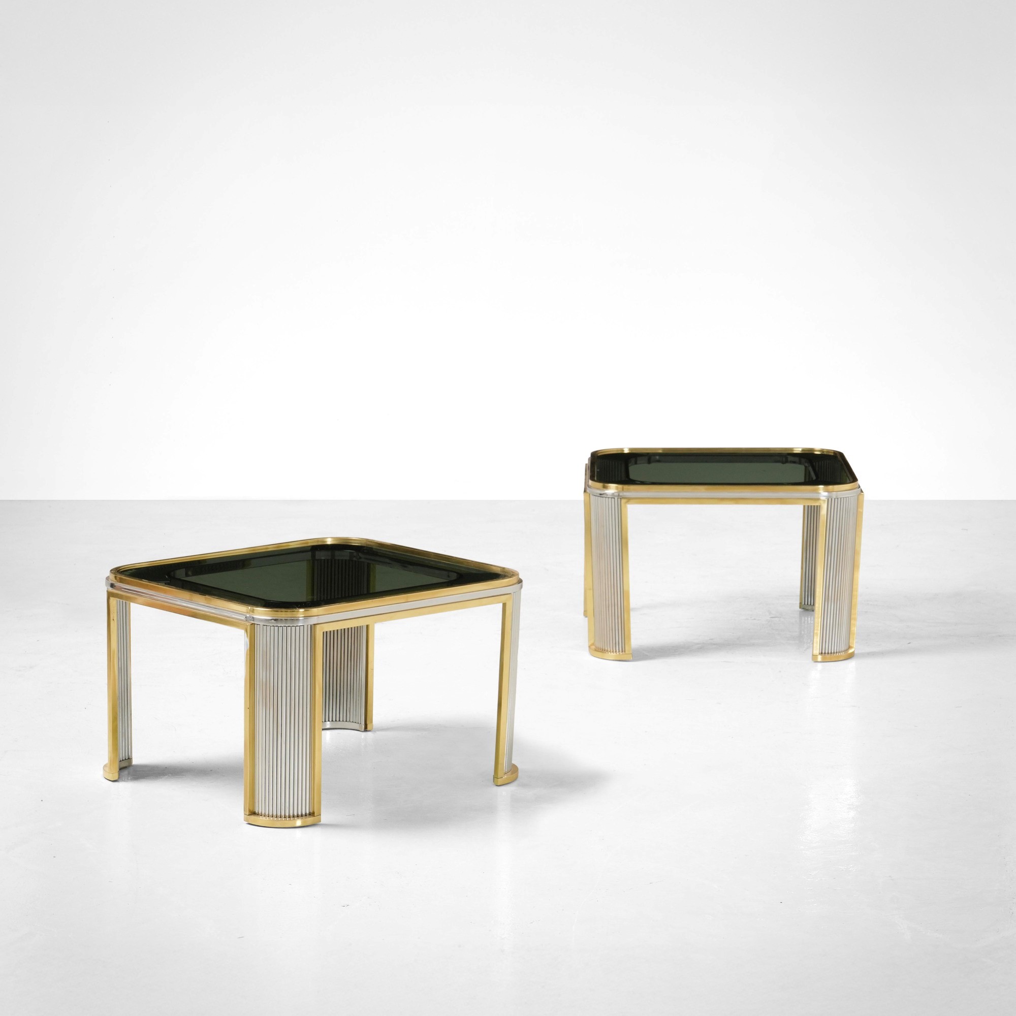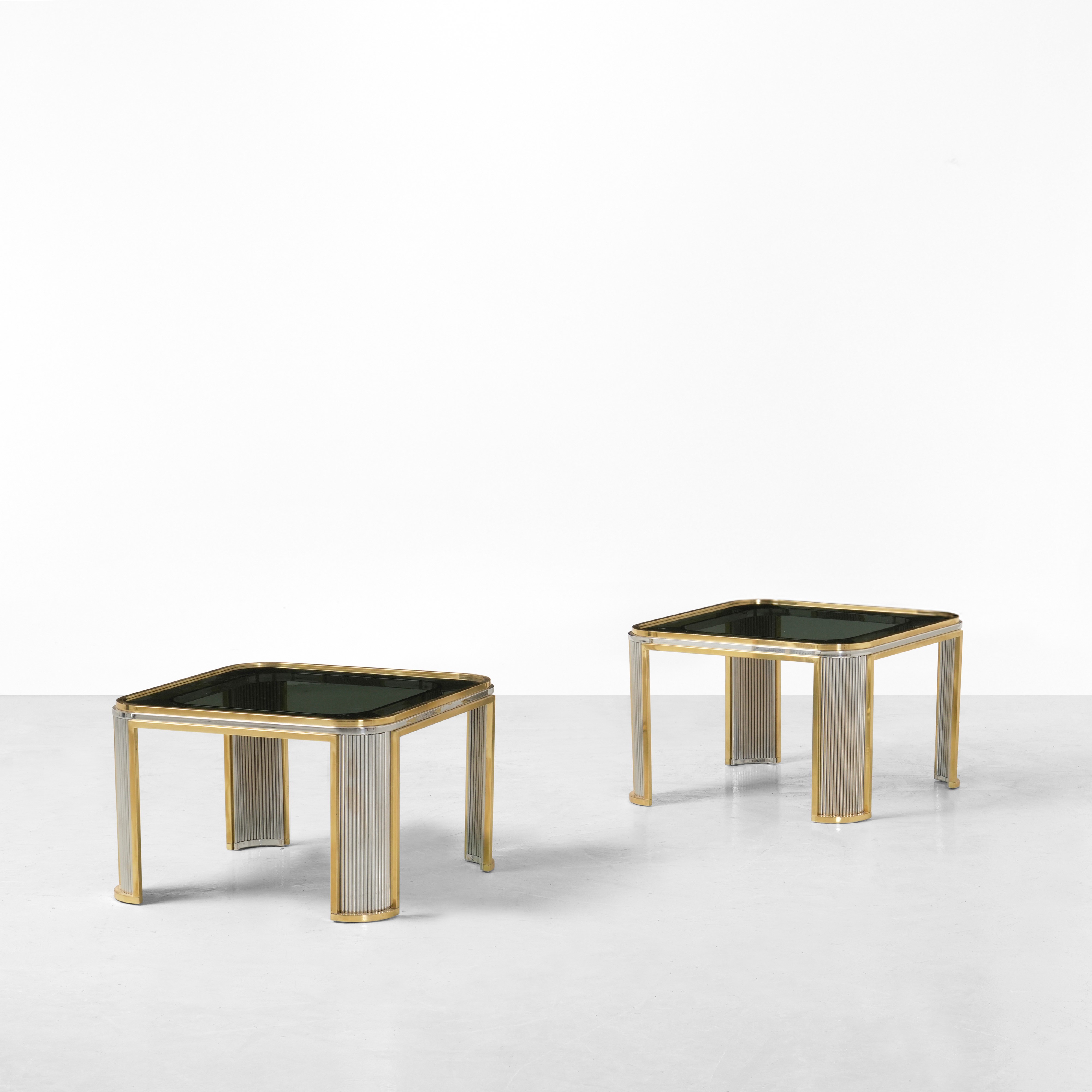 Struttura e sostegni in metallo cromato e ottone. Piani in vetro colorato.