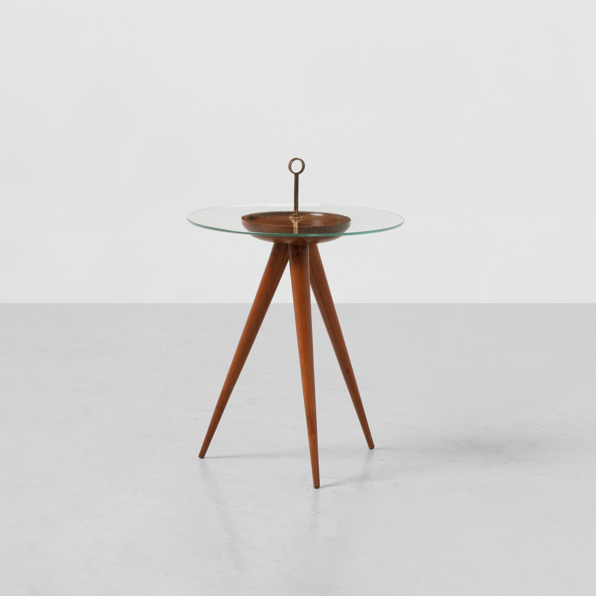 Struttura in legno, piano in cristallo molato e dettagli in ottone.