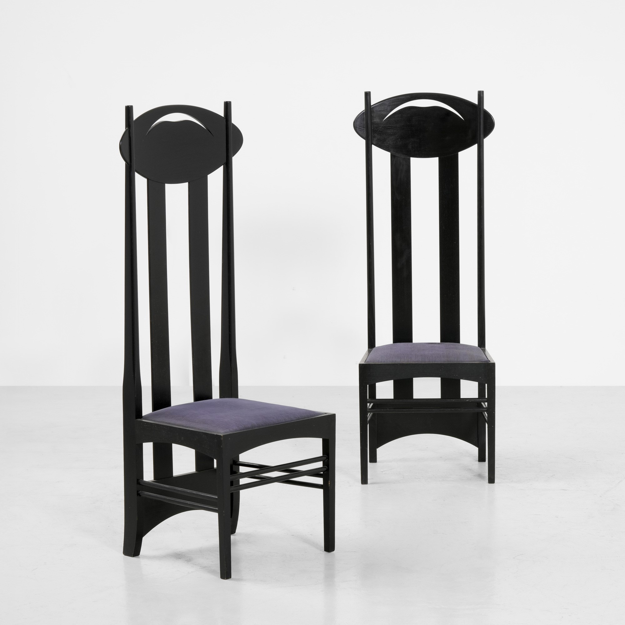 Struttura in legno ebanizzato con alte schienale traforate e sedute rivestite di tessuto.