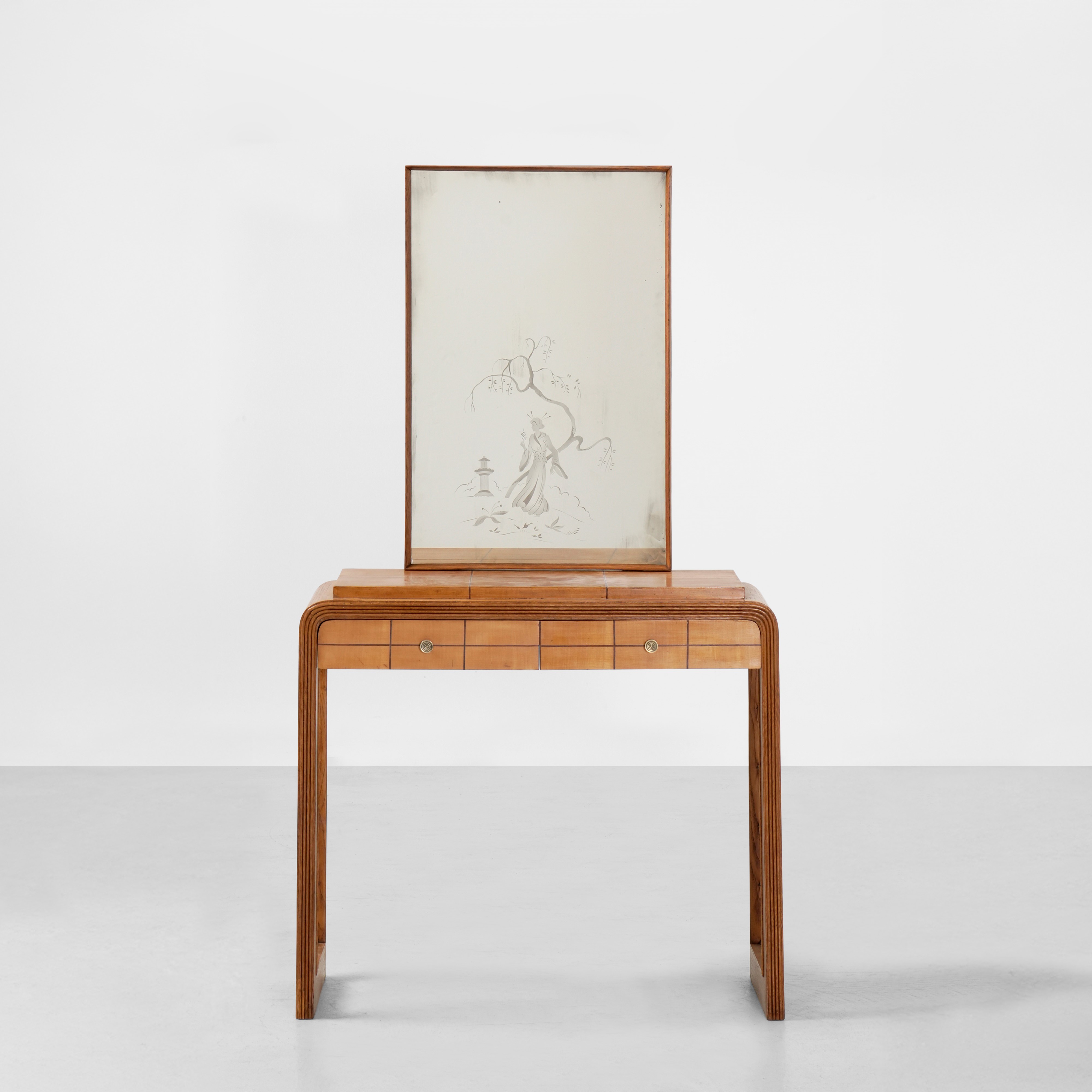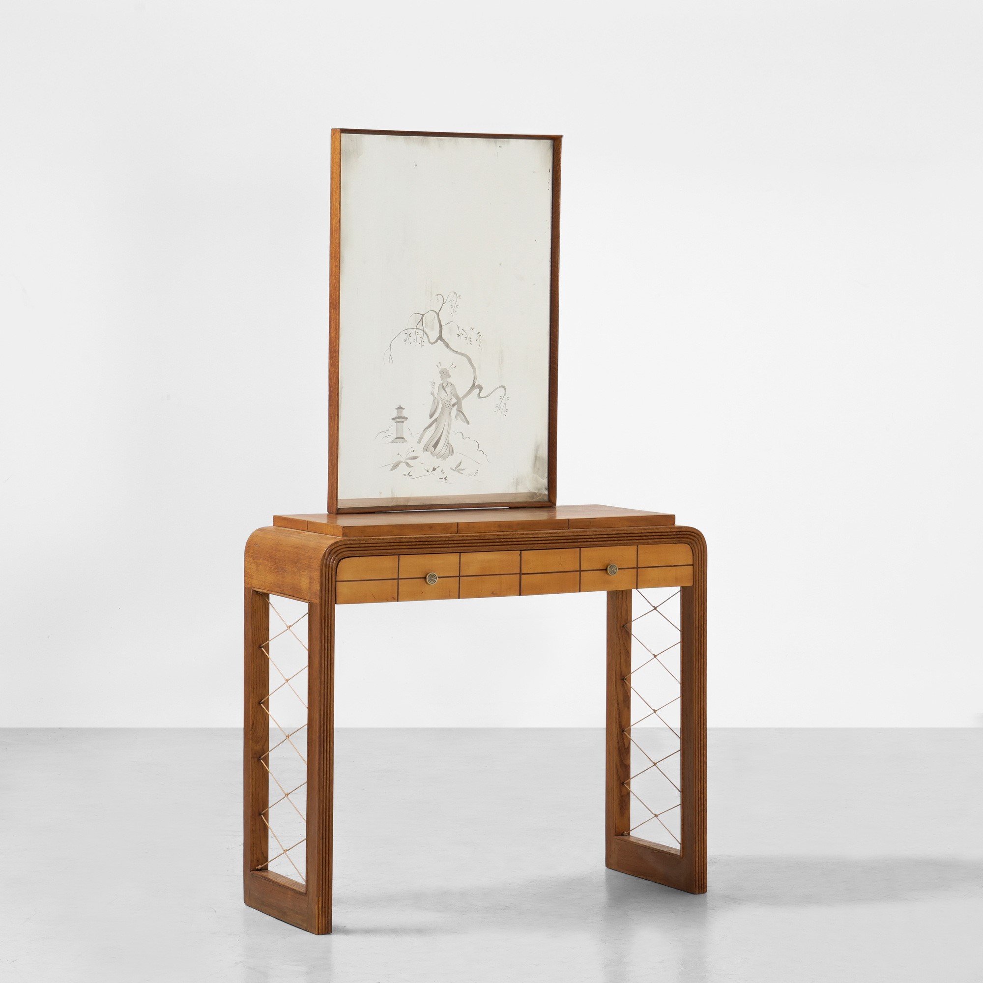 Struttura in legno e legno impiallacciato. Cristallo specchiato, dettagli in corda e pomelli in ottone.