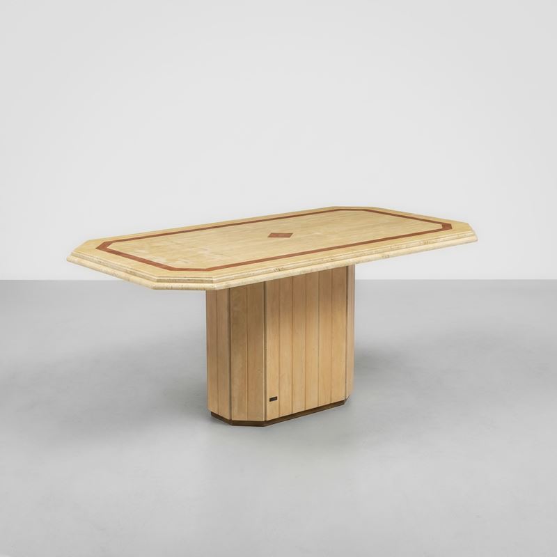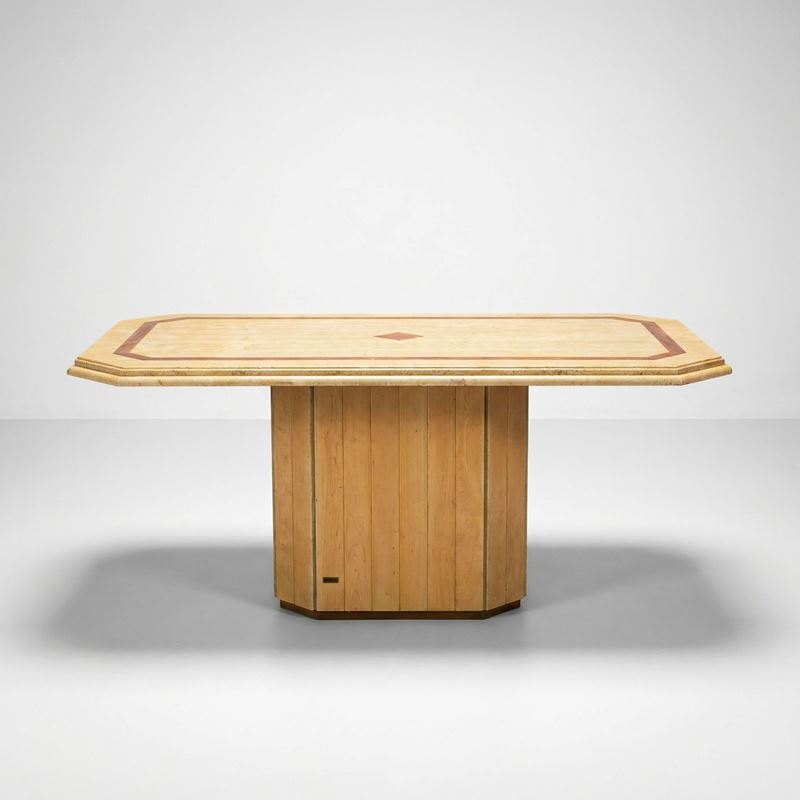 Struttura e sostegni in travertino verniciato, dettagli in ottone e piano a decoro intarsiato.
