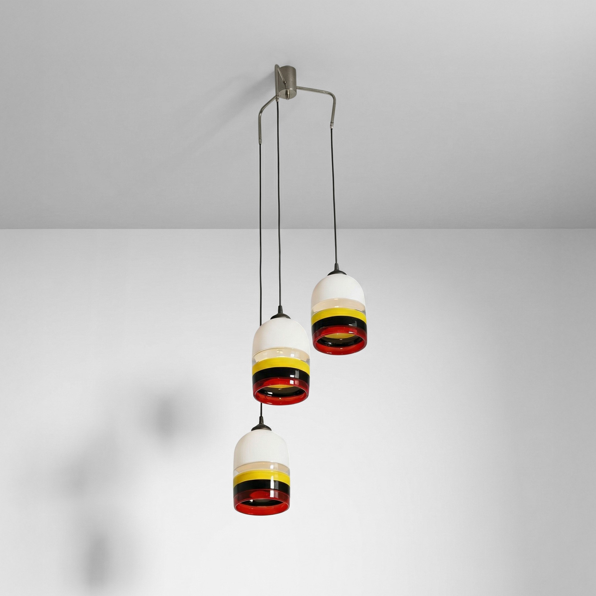 Struttura ad altezza regolabile in metallo e diffusori in vetro soffiato policromo di forte spessore.
