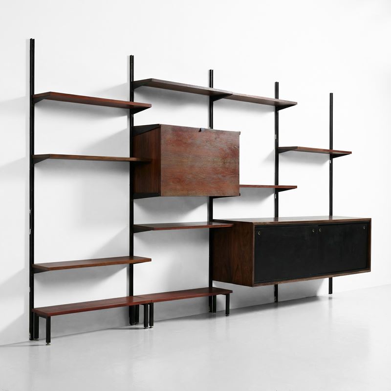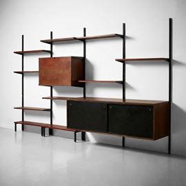 Struttura in metallo, cassetti e mensole in legno laccato e impiallacciato.