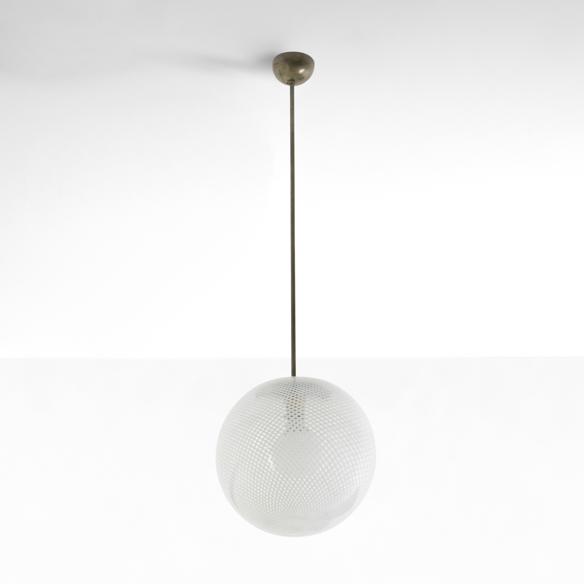 Struttura in ottone, diffusore in vetro di Murano a reticello cristallo e lattimo.