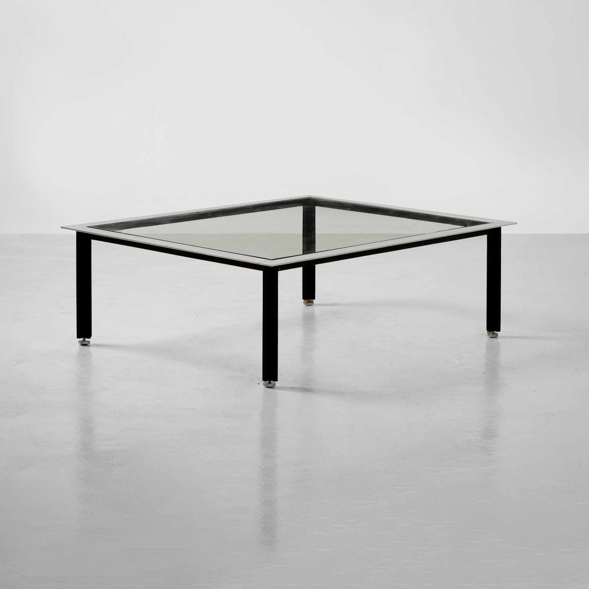 Struttura in metallo laccato e acciaio con piano in cristallo molato.