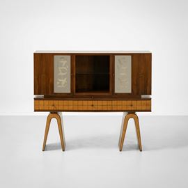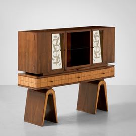 Struttura in legno e impiallacciatura di radica, rivestimenti in vetro specchiato decorato inciso.